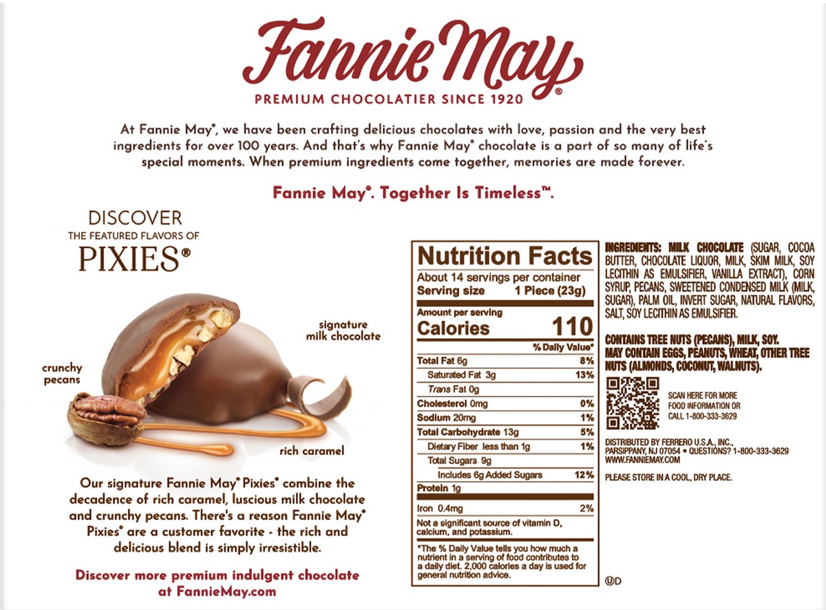 Milk Chocolate (Sugar, Cocoa Butter, Chocolate Liquor, Milk, Skim Milk, Soy Lecithin as Emulsifier, Vanilla Extract), Corn Syrup, Pecans, Sweetened Condensed Milk (Milk, Sugar), Palm Oil, Invert Sugar…