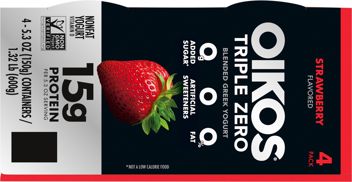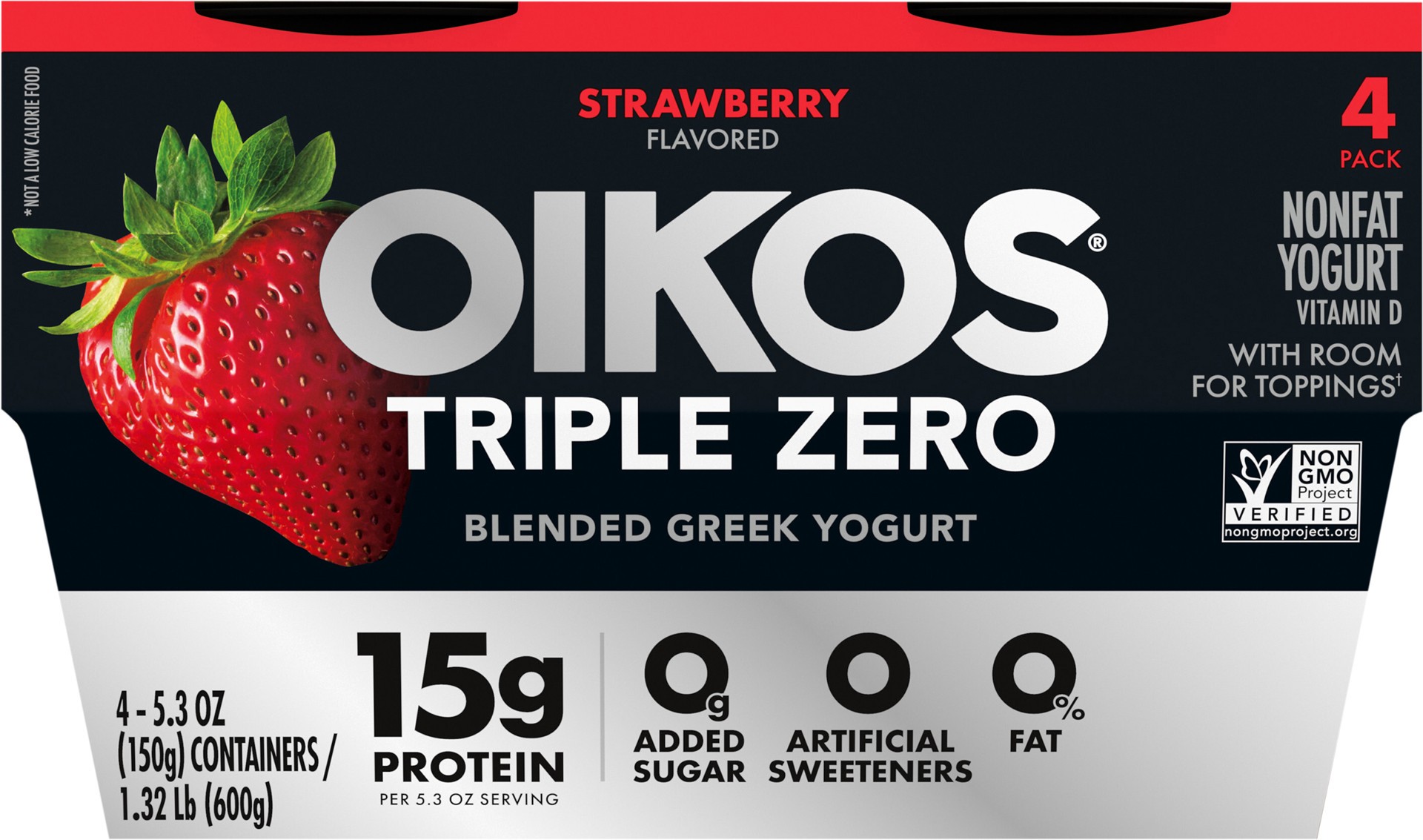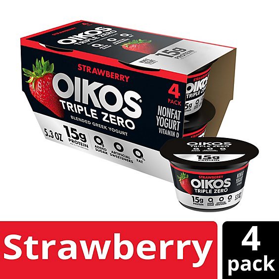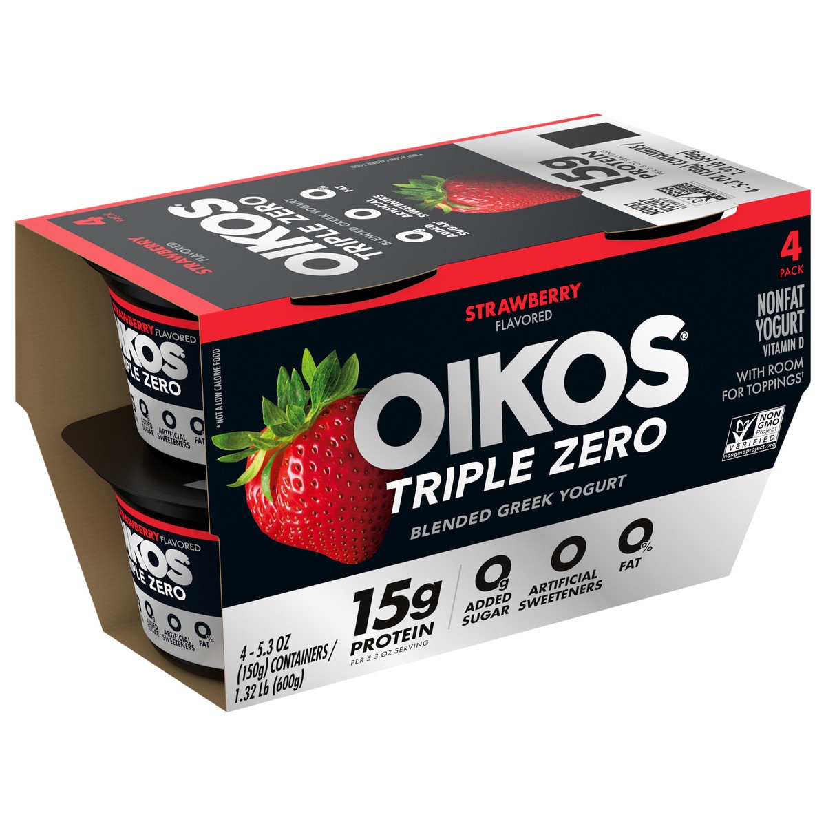 Enjoy epic tastes with Oikos Triple Zero Nonfat Strawberry Greek Yogurt Pack, four delicious nonfat Greek yogurt cups with more of what you want and less of what you don''t. Each Oikos Triple Zero yog…