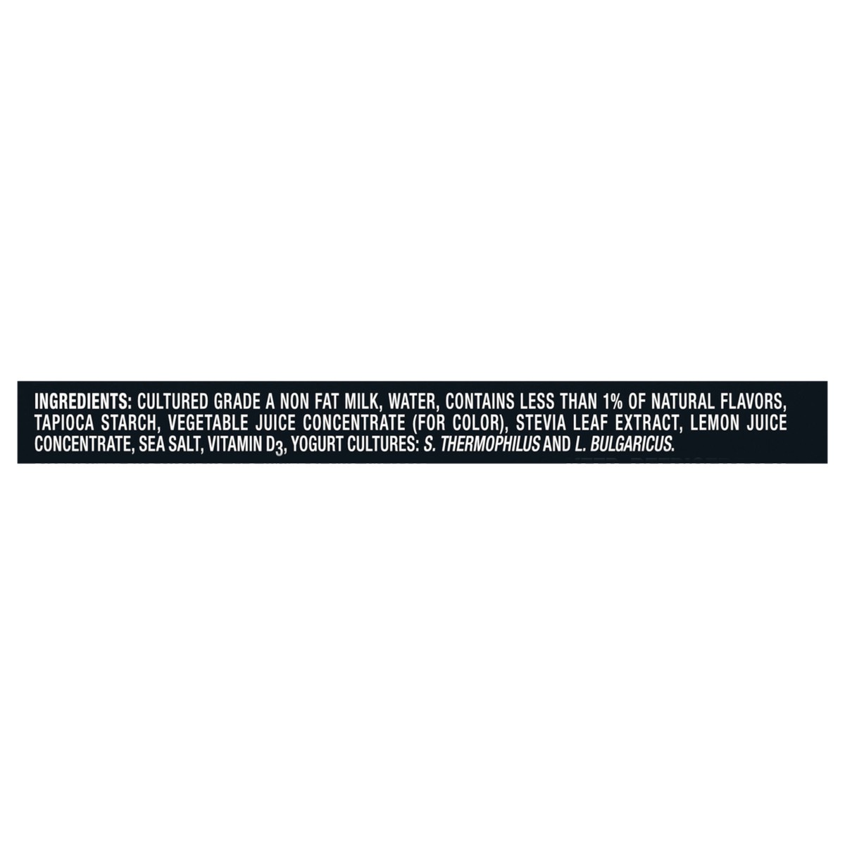 Cultured Grade A Non Fat Milk, Water, Contains Less than 1% of Natural Flavors, Tapioca Starch, Vegetable Juice Concentrate (for Color), Stevia Leaf Extract, Lemon Juice Concentrate, Sea Salt, Vitamin…