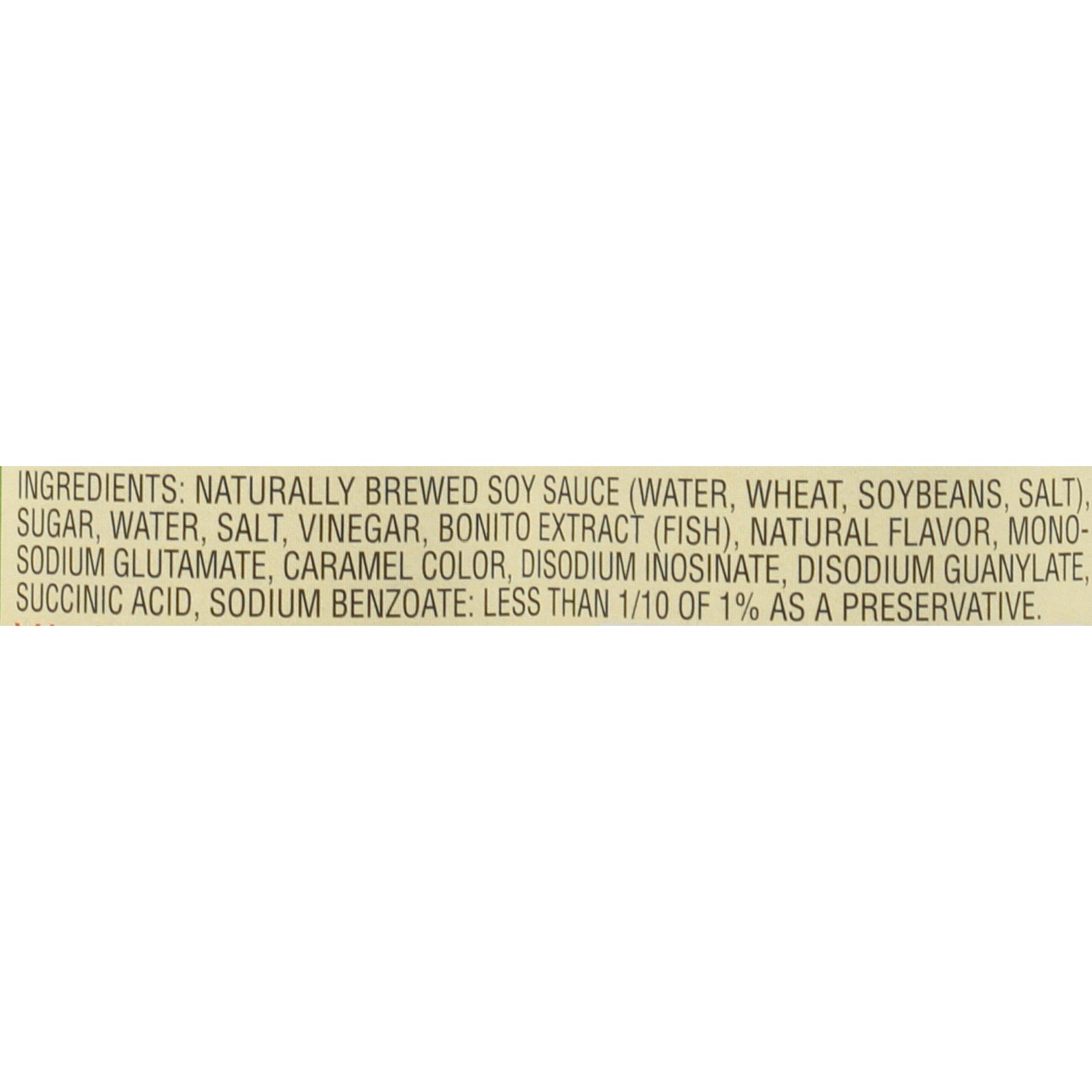 Soy Sauce (Water, Soybeans, Wheat, Salt), Sugar, Water, Salt, Bonito Extract (Fish), Natural Flavors, Monosodium Glutamate, Vinegar, Caramel Color, Sodium Benzoate: Less than 1/10 of 1% as a Preservat…
