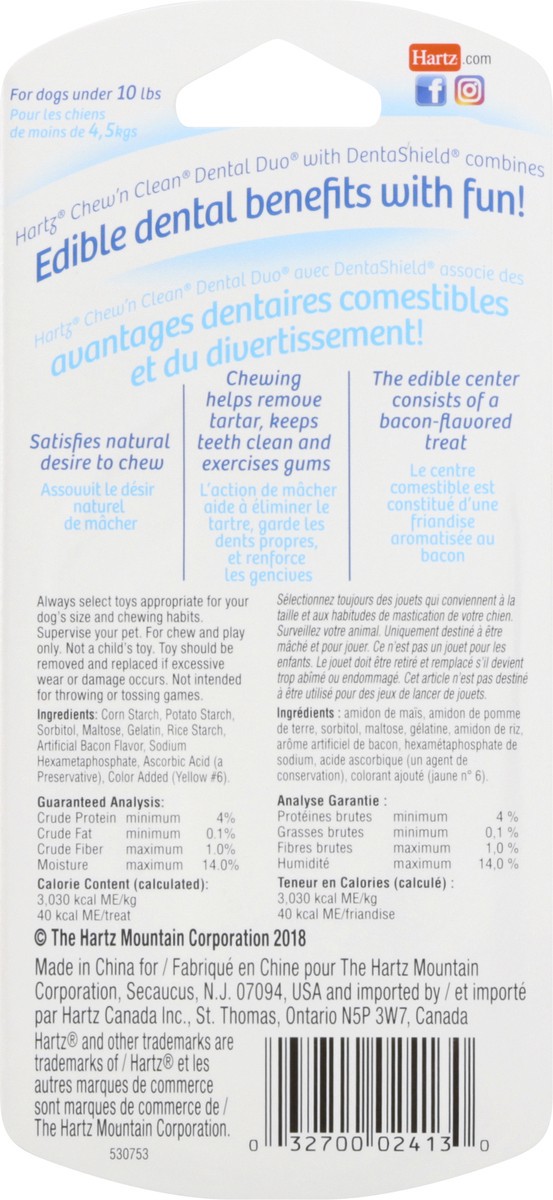 Calorie Content (calculated): 3,030 kcal ME/kg; 40 kcal ME/treat. Toy + treat for dogs. For dogs under 10 lbs. With DentaShield for cleaner teeth. Centre comestible. Hartz Chew'n Clean Dental Duo with…