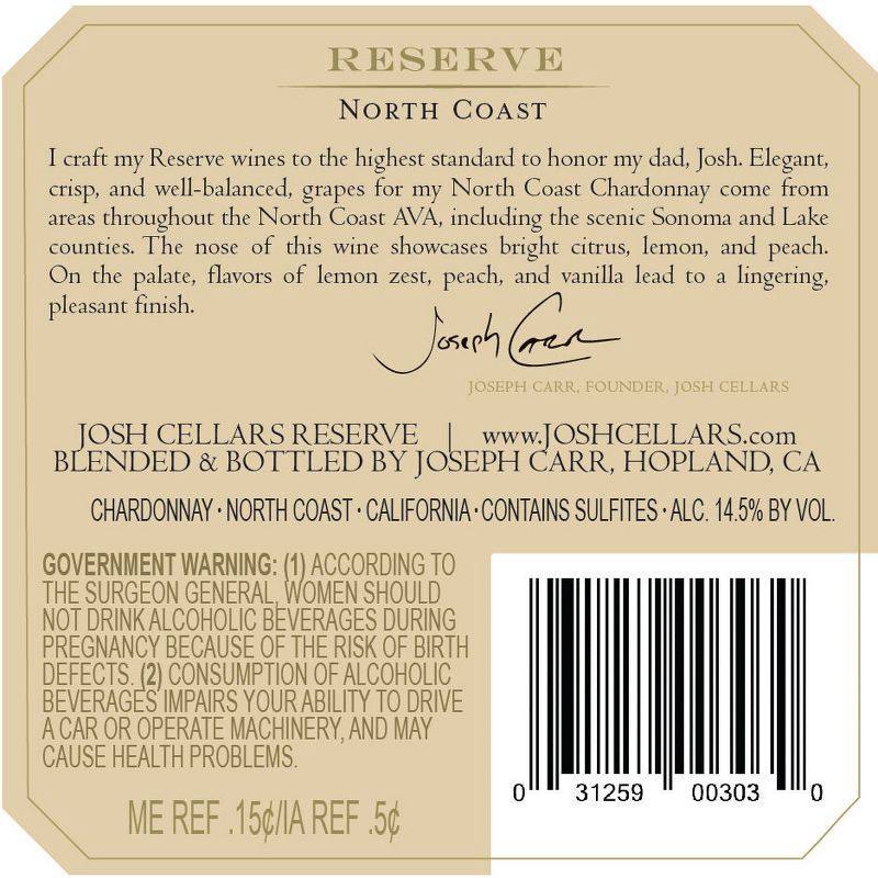 - One 750 ml wine bottle of Josh Cellars Reserve North Coast Chardonnay