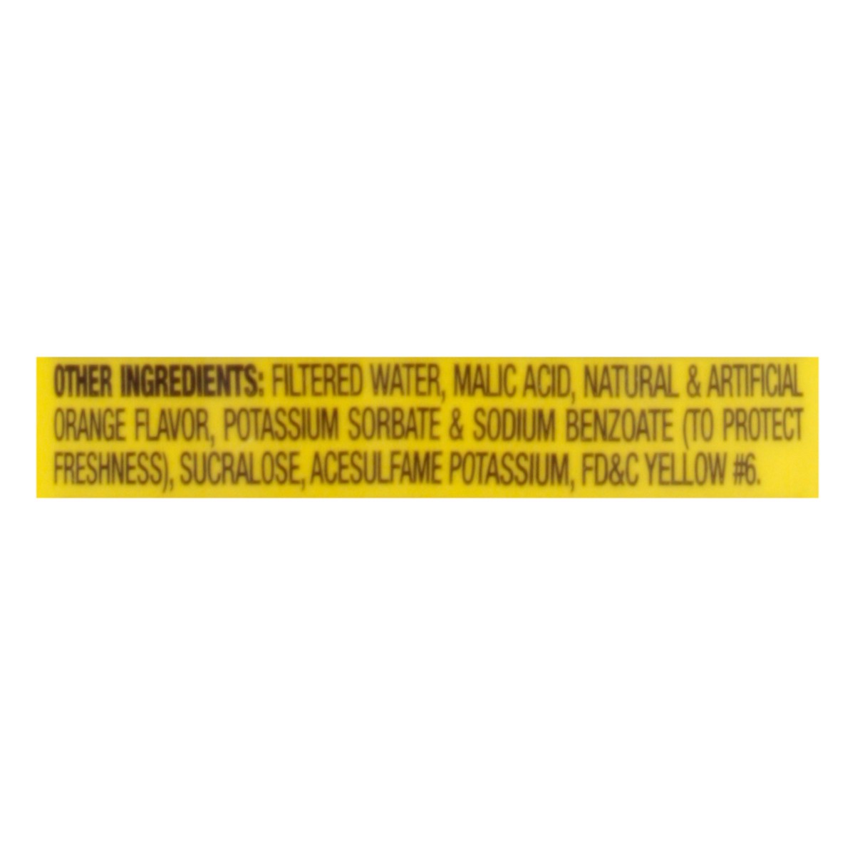 Other Ingredients: Filtered Water, Malic Acid, Natural & Artificial Orange Flavor, Potassium Sorbate & Sodium Benzoate (to Protect Freshness), Sucralose, Acesulfame Potassium, FD&C Yellow 6.