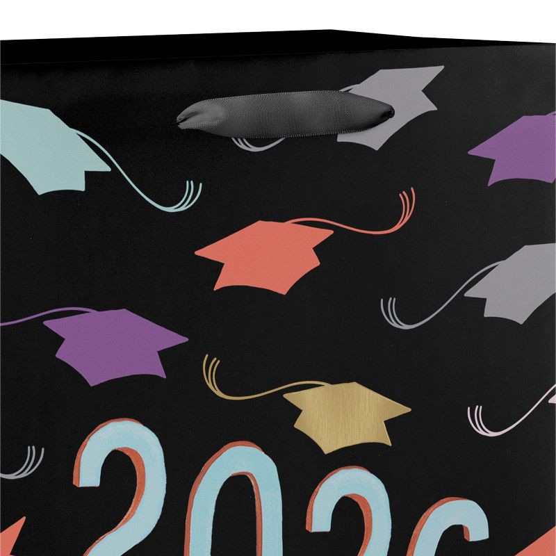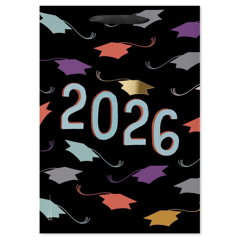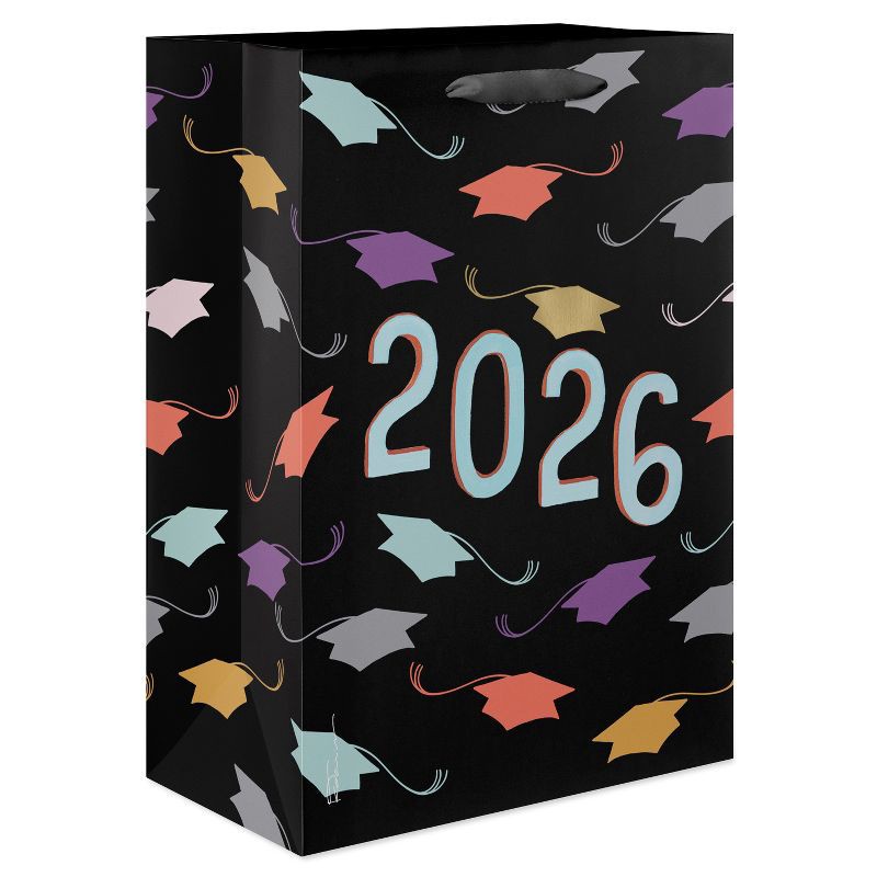 - DESIGN & FINISHINGS: This graduation gift bag features a stylish black background with vibrant, multi-colored graduation caps and bold '2026' text in brushstroke font. The design celebrates academic achievement and the bright future ahead.