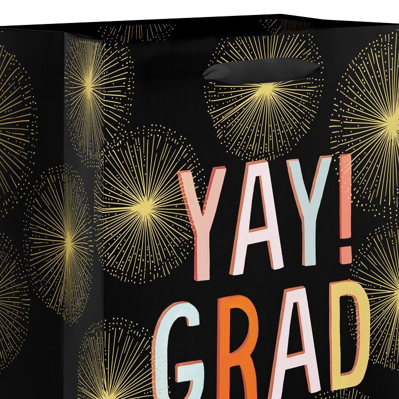 - DESIGN & FINISHINGS: This large graduation gift bag features a vibrant gold burst pattern and bold, colorful lettering against a sleek black background, creating an eye-catching and festive presentation.