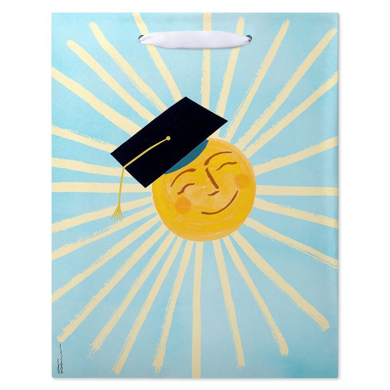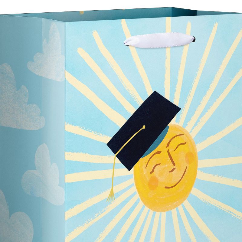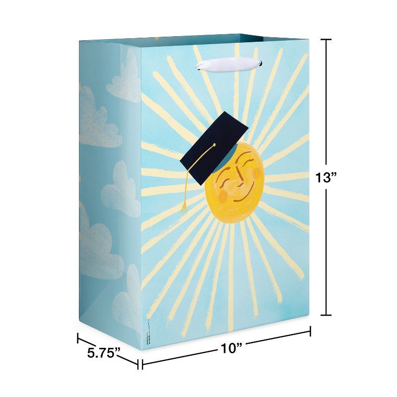 - DESIGN & FINISHINGS: Celebrate graduation with this large gift bag featuring a vibrant sunshine graphic wearing a graduation cap, set against a sky-blue background with radiant yellow rays and cloud patterns.