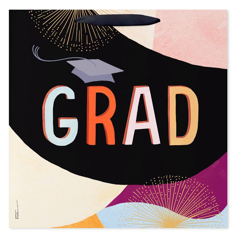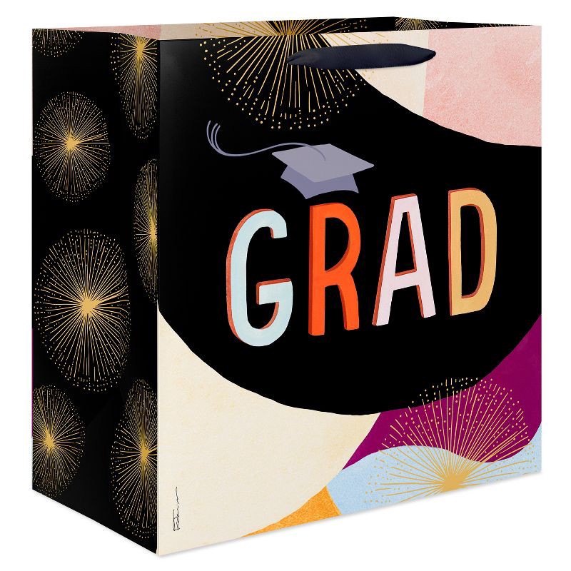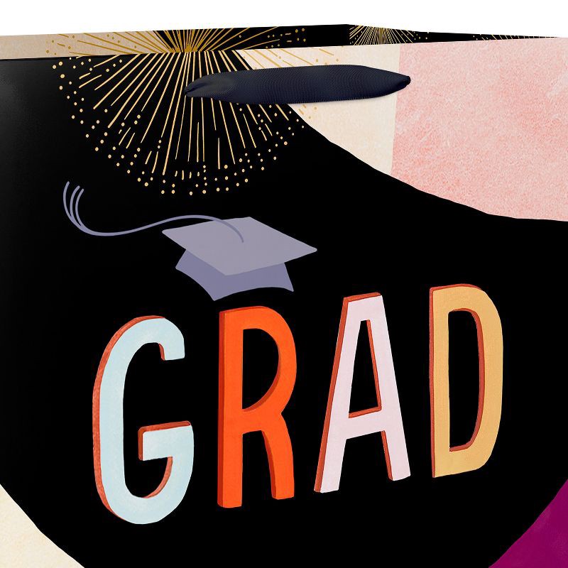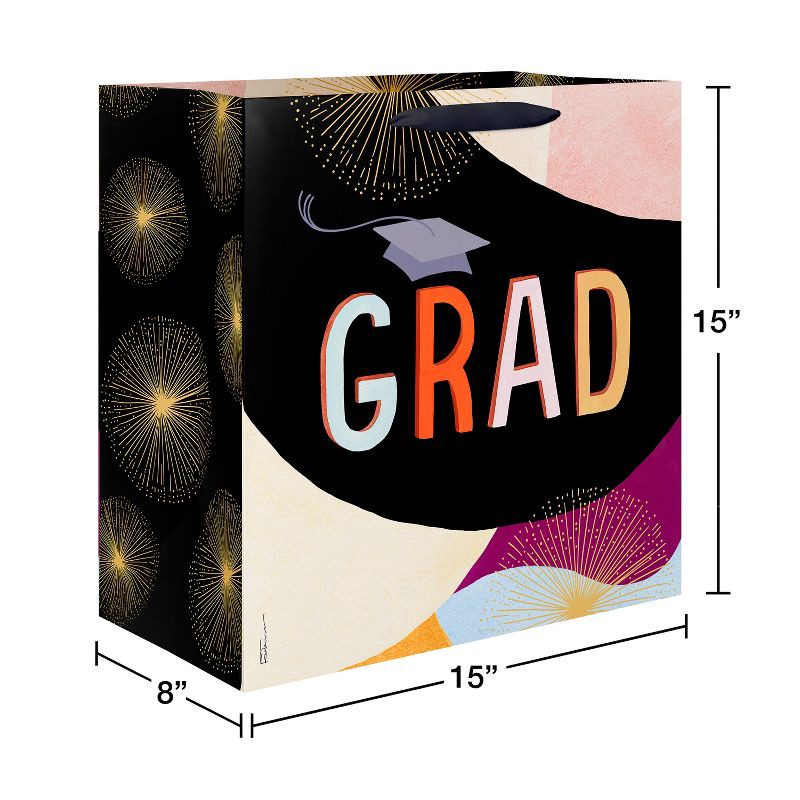 - DESIGN & FINISHINGS: Celebratory jumbo bag featuring abstract artwork with shining gold fireworks, a bold 'GRAD' lettering, and a graduation cap, making it perfect for any graduate's special day.