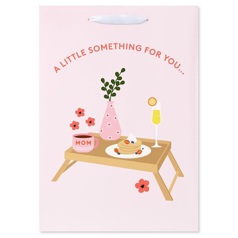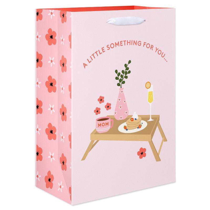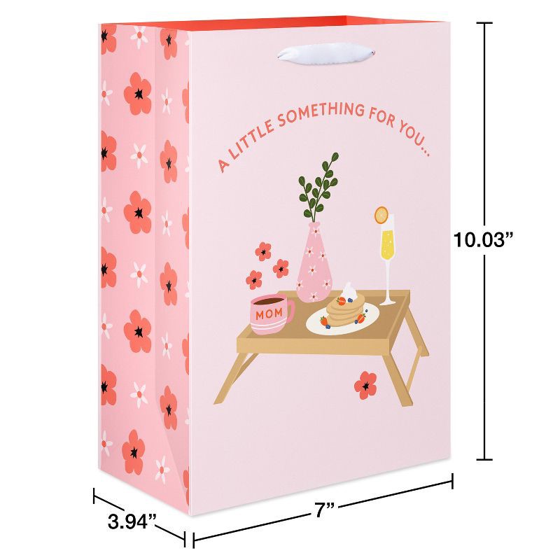 - DESIGN & FINISHINGS: This charming medium-sized gift bag features a delightful illustration of a breakfast tray with a flower vase, pancakes, and a 'Mom' mug. The pink background and floral accents add a sweet, festive touch, making it a perfect way to present gifts to your mom.