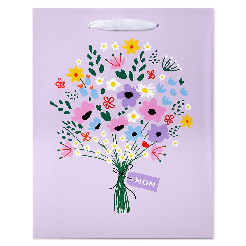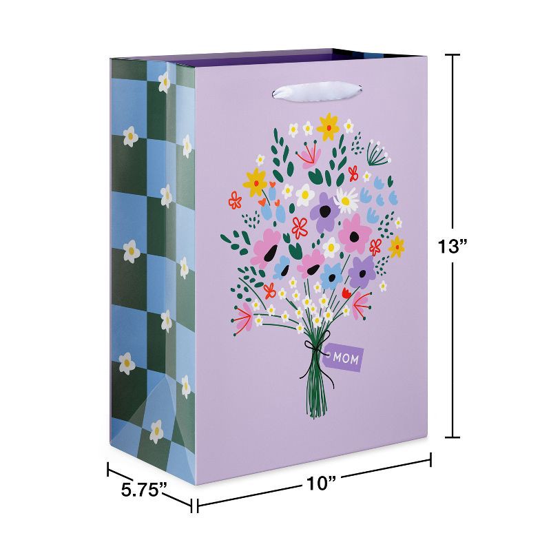 - DESIGN & FINISHINGS: This large Mother's Day gift bag features a beautiful floral bouquet design on a soft purple background, adorned with vibrant flowers and a tag that spells out 'MOM'. The sturdy white handles add elegance and ease of carrying.