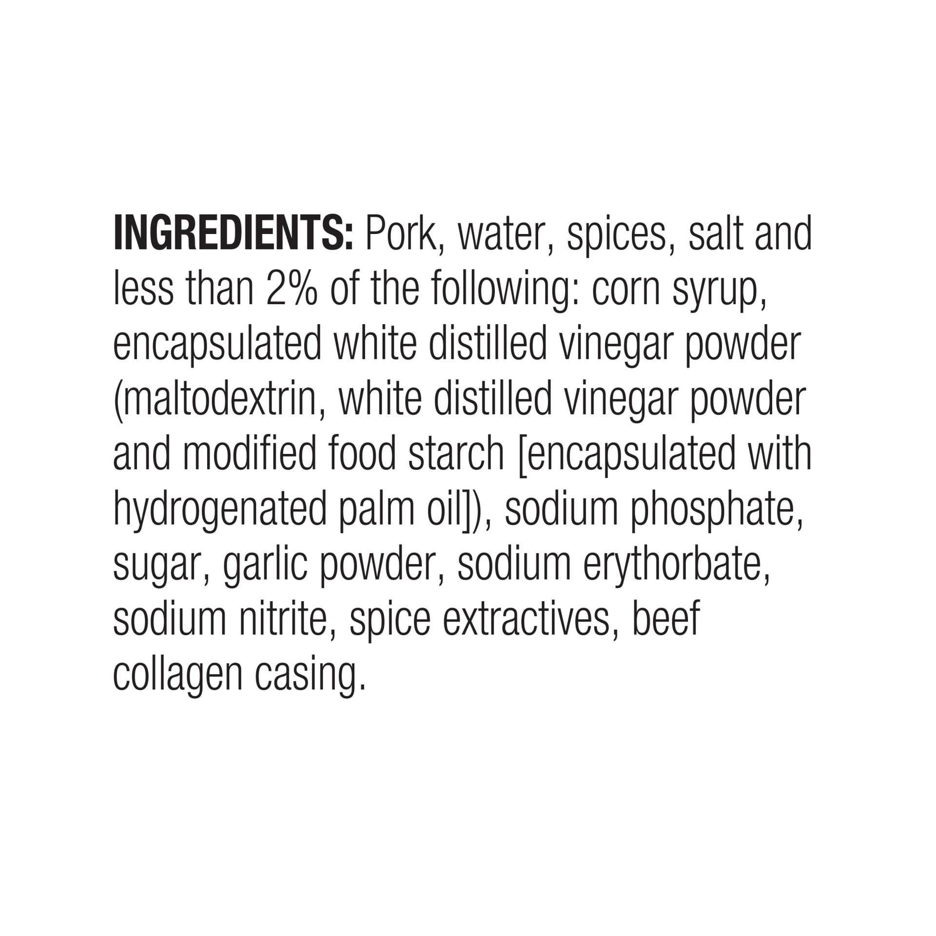 Pork, Water, Spices, Salt, and Less than 2% of the Following: Corn Syrup, Encapsulated White Distilled Vinegar Powder (Maltodextrin, Hydrogenated Palm Oil, White Distilled Vinegar, Modified Food Starc…