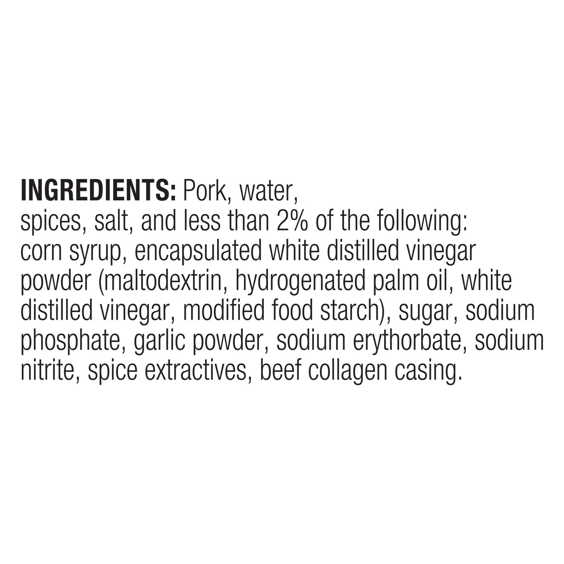 Ingredients: Pork, water, spices, salt, and less than 2% of the following: corn syrup, encapsulated white distilled vinegar powder (maltodextrin, hydrogenated palm oil, white distilled vinegar, modifi…