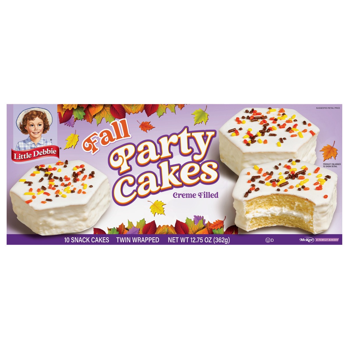 Conveniently twin-wrapped, Little Debbie Fall Party Cakes are a great surprise for a school bash or an extra special hand out to party goers this fall. Moist yellow cake layered with thick creme filli…