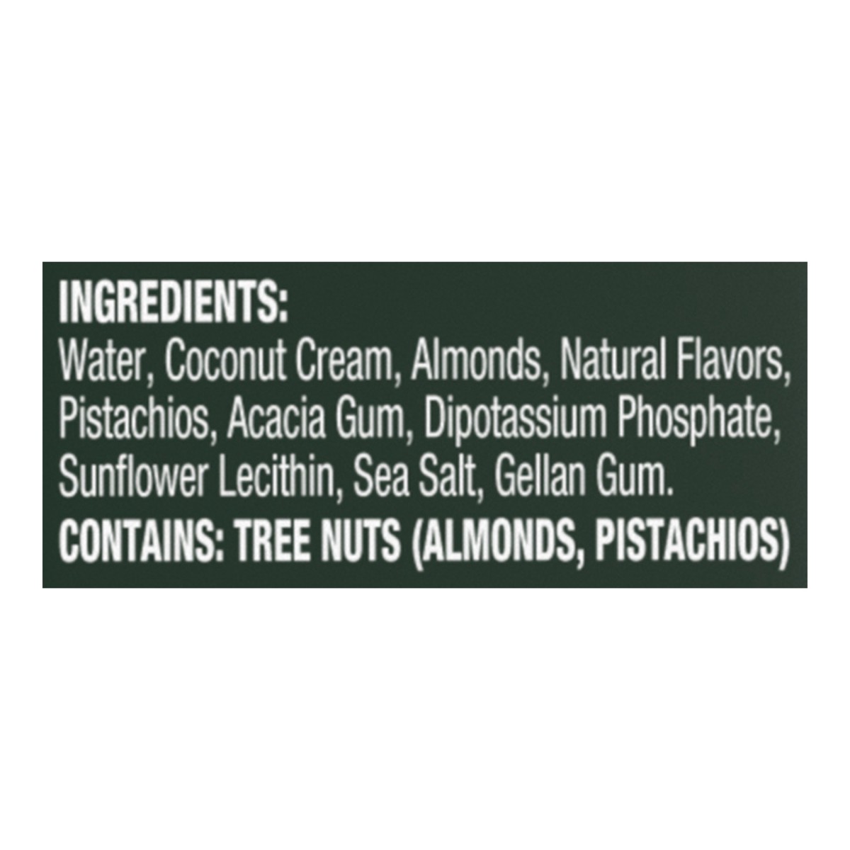 Water, Coconut Cream, Almonds, Natural Flavors, Pistachios, Acacia Gum, Dipotassium Phosphate, Sunflower Lecithin, Sea Salt, Gellan Gum.