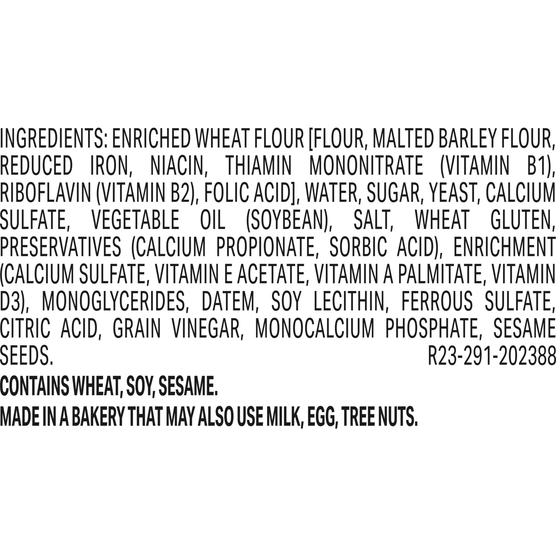 Enriched Wheat Flour [Flour, Malted Barley Flour, Reduced Iron, Niacin, Thiamin Mononitrate (Vitamin B1), Riboflavin (Vitamin B2), Folic Acid], Water, Sugar, Yeast, Calcium Sulfate, Vegetable Oil (Soy…