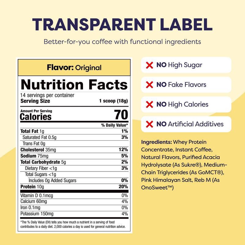 Whey Protein Concentrate, 100% Arabica Instant Coffee, Natural Flavors, Purified Acacia Hydrolysate (as Sukre), Medium-Chain Triglycerides (as goMCT), Pink Himalayan Salt, Reb M (as OnoSweet).