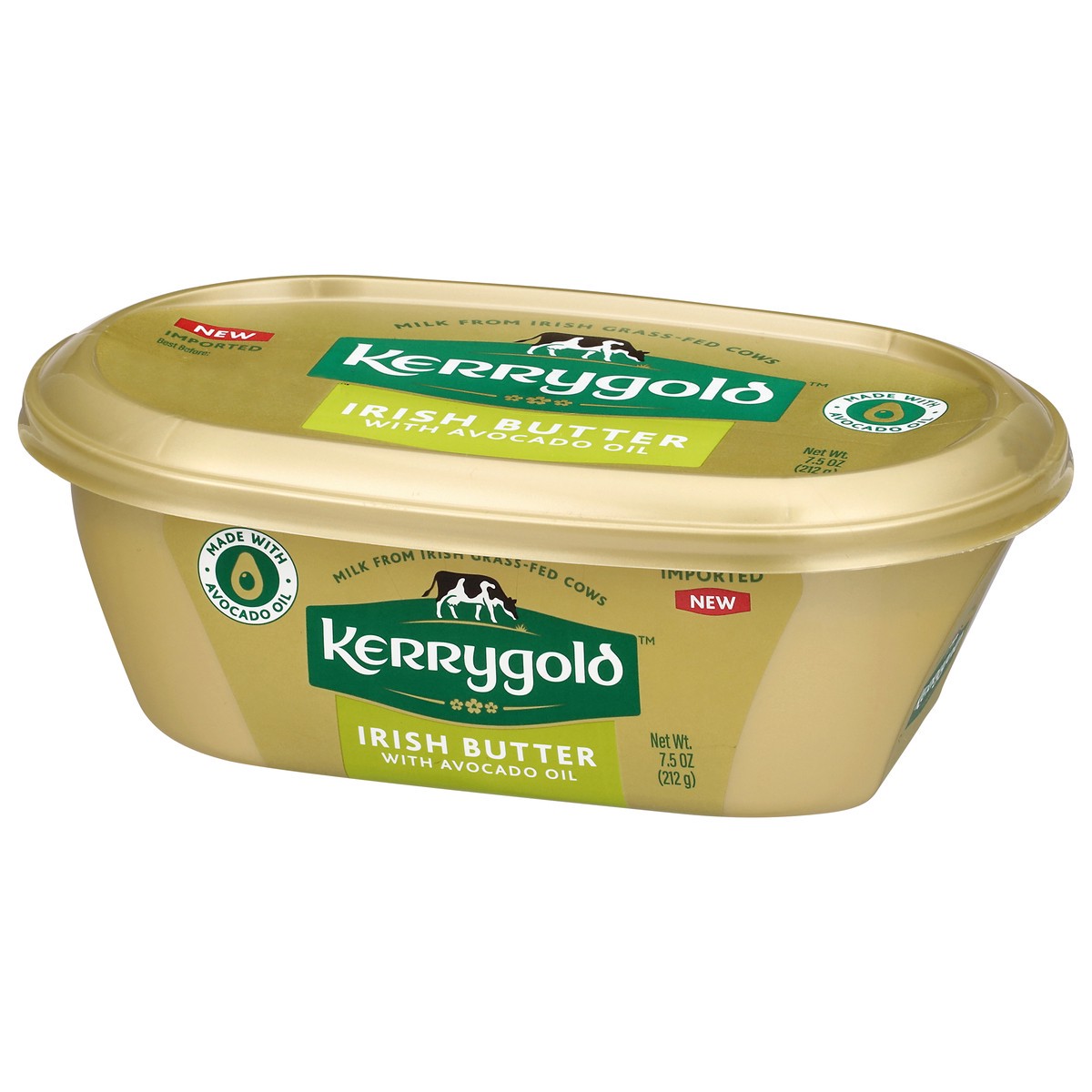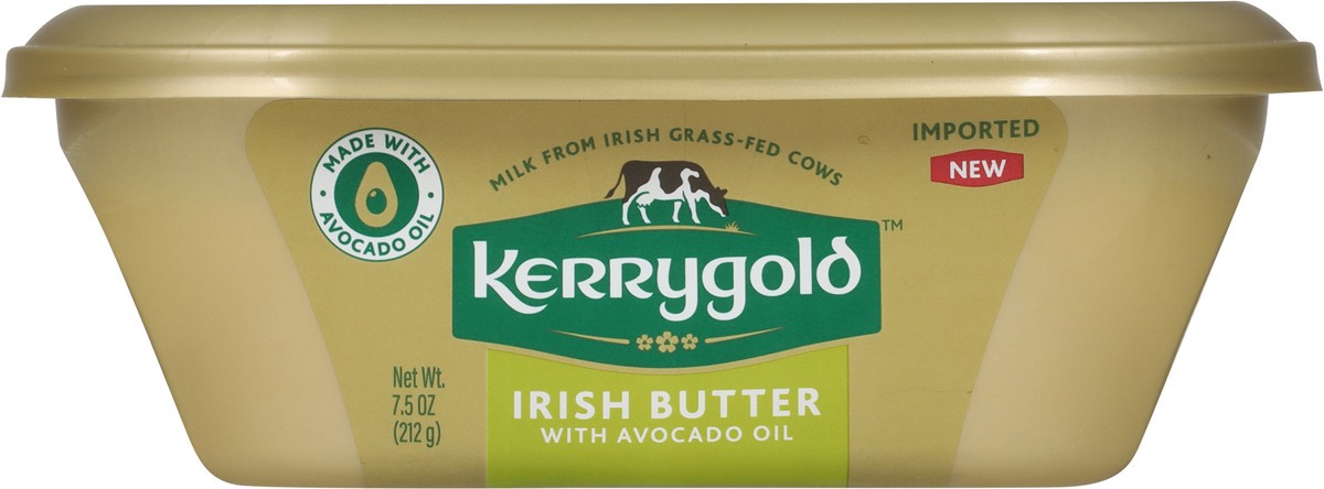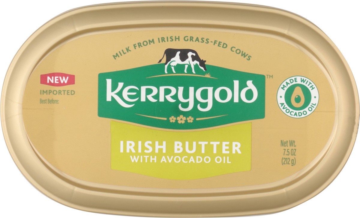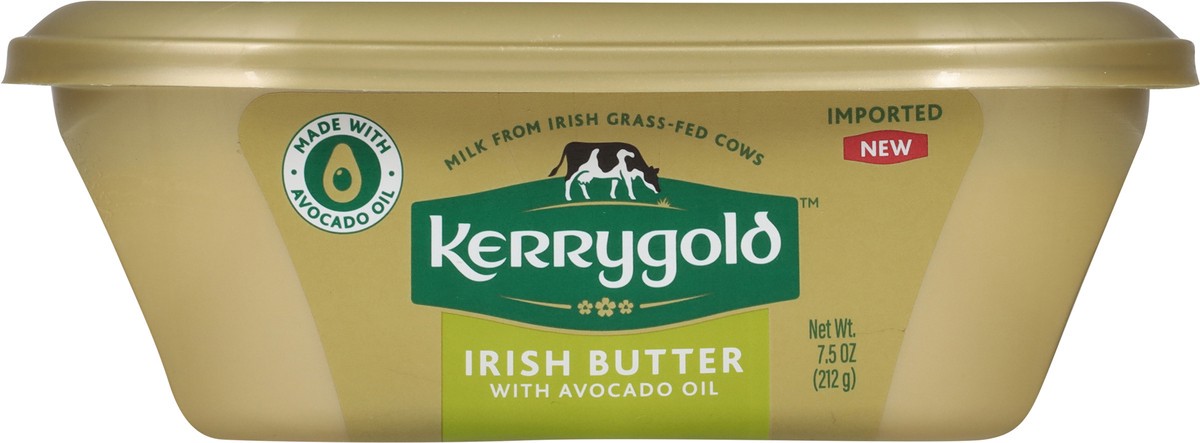 Irish butter with avocado oil. Milk from Irish grass-fed cows. Imported. New. Packed for Ornua foods. KerrygoldUSA.com. @KerrygoldUSA. For more information on our products, visit kerrygolduse.com/iris…