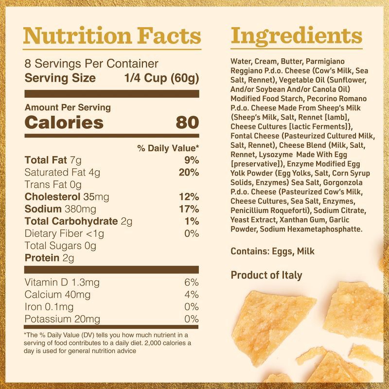 Water, Cream, Butter, Sunflower Oil, Parmigiano Reggiano PDO Cheese (Milk, Sea Salt, Enzyme), Modified Corn Starch, Pecorino Romano PDO Cheese made from Sheep's Milk (Sheep's Milk, Salt, Enzyme), Font…