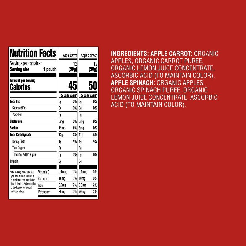 Apple Carrot: Organic Apples, Organic Carrot Puree, Organic Lemon Juice Concentrate, Ascorbic Acid (to Maintain Color). Apple Spinach: Organic Apples, Organic Spinach Puree, Organic Lemon Juice Concen…