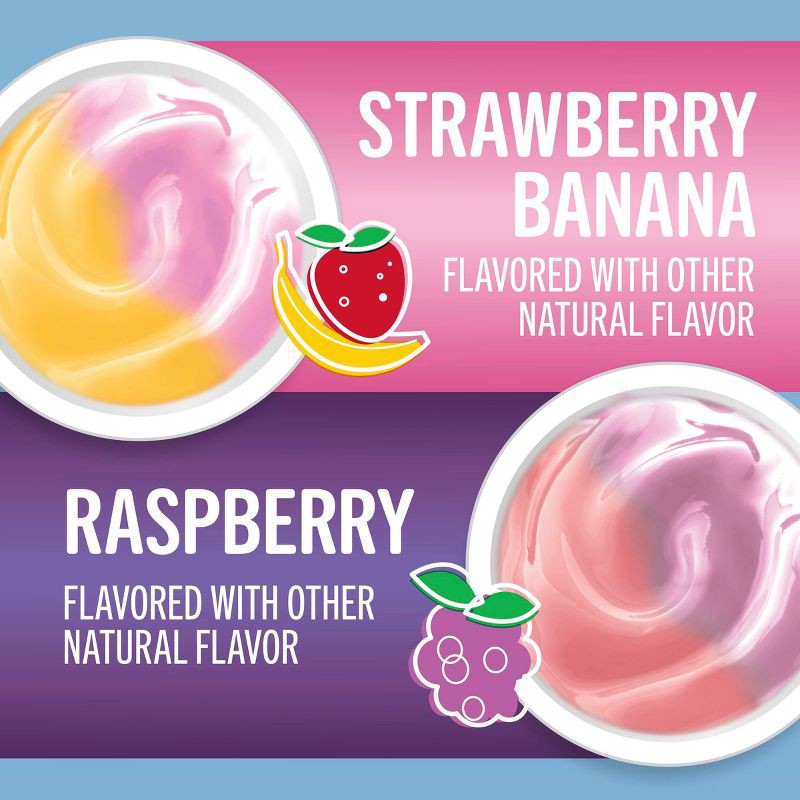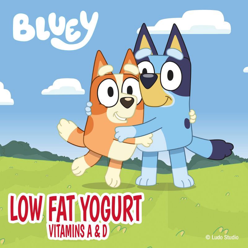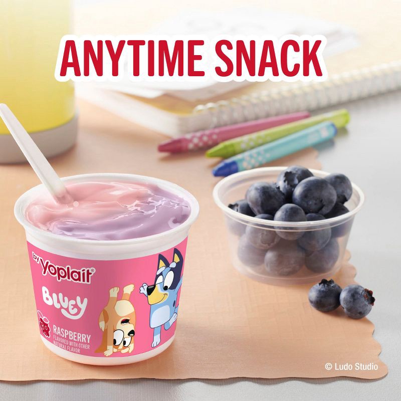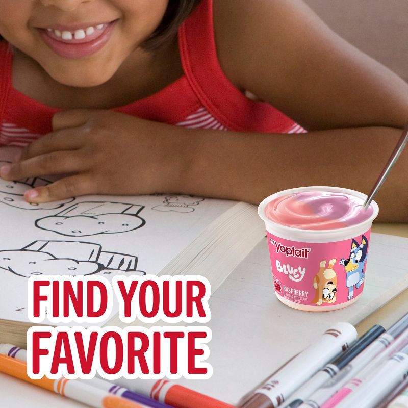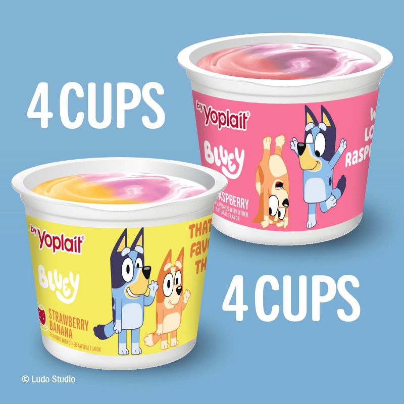 - CONTAINS: One 32 oz Variety Pack of Yoplait Bluey Low Fat Kids Yogurt in strawberry banana and raspberry flavors; Eight 4 oz yogurt cups