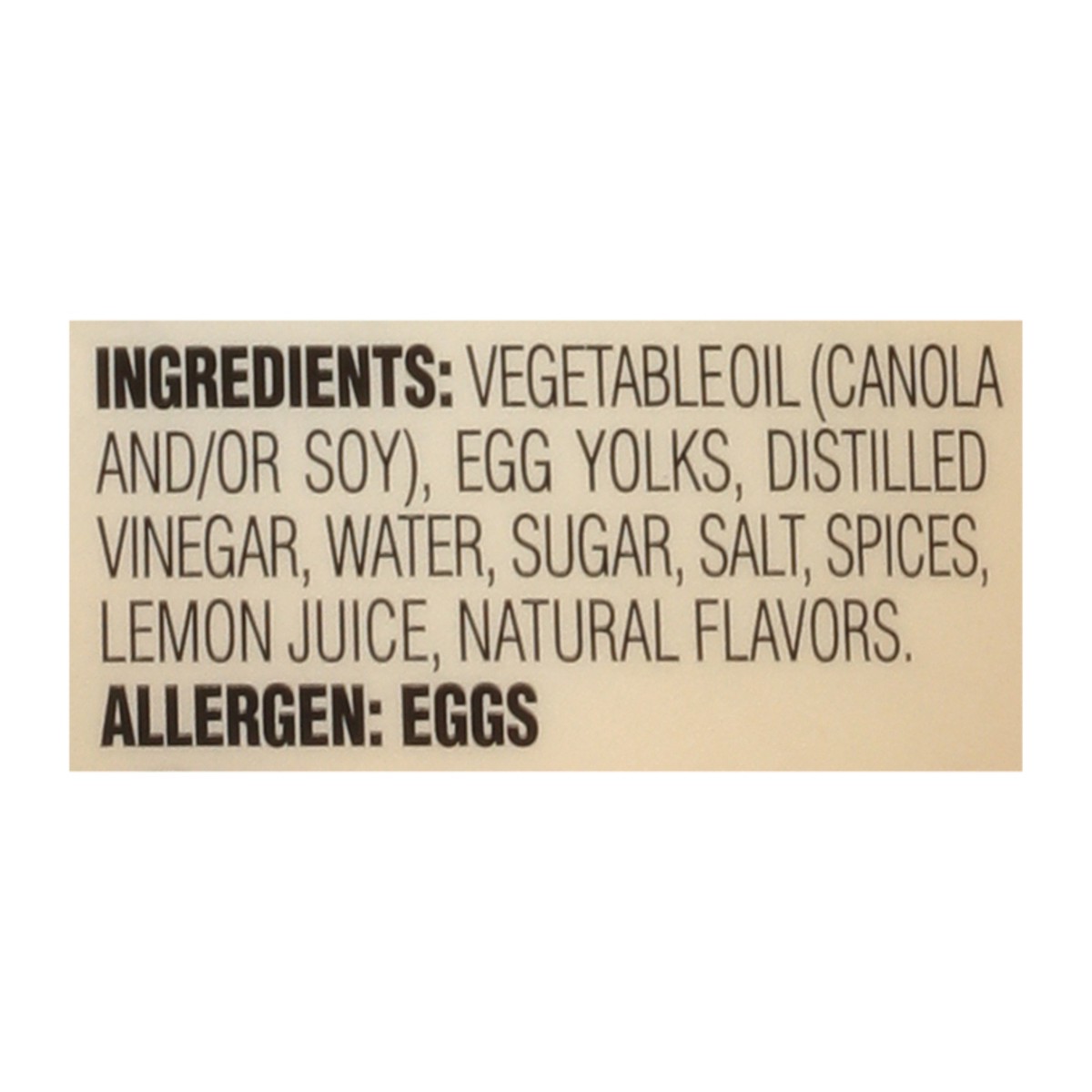 Vegetableoil (Canola and/or Soy), Egg Yolks, Distilled Vinegar, Water, Sugar, Salt, Spices, Lemon Juice, Natural Flavors.