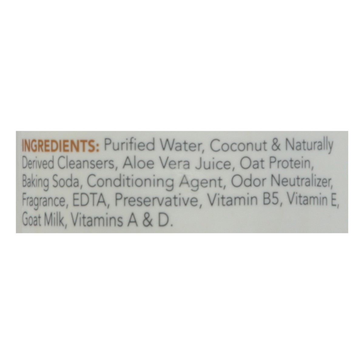 Purified Water, Coconut & Naturally Derived Cleansers, Aloe Vera Juice, Oat Protein, Baking Soda, Conditioning Agent, Odor Neutralizer, Fragrance, EDTA, Preservative, Vitamin B5, Vitamin E Goat Milk, …