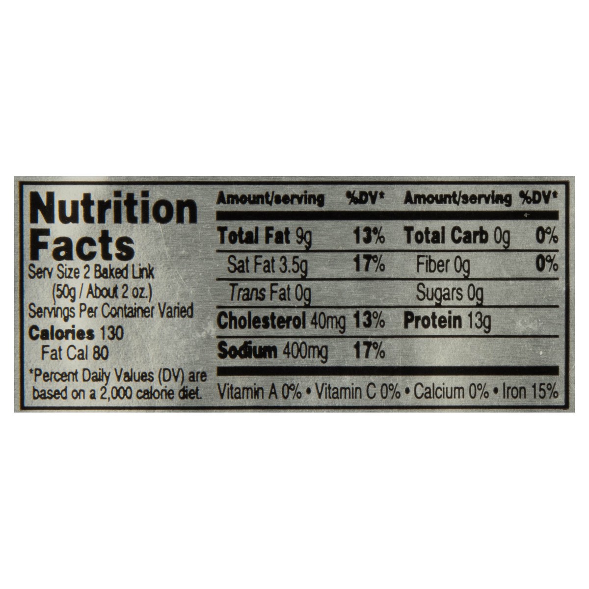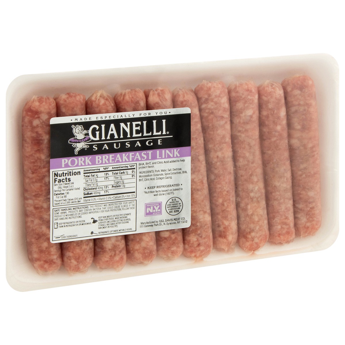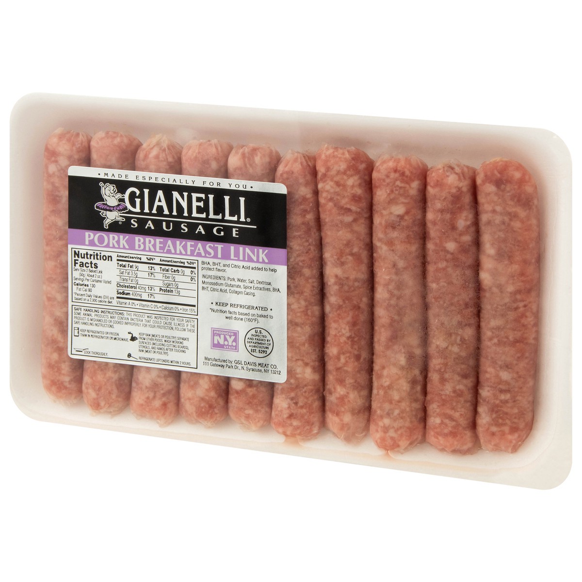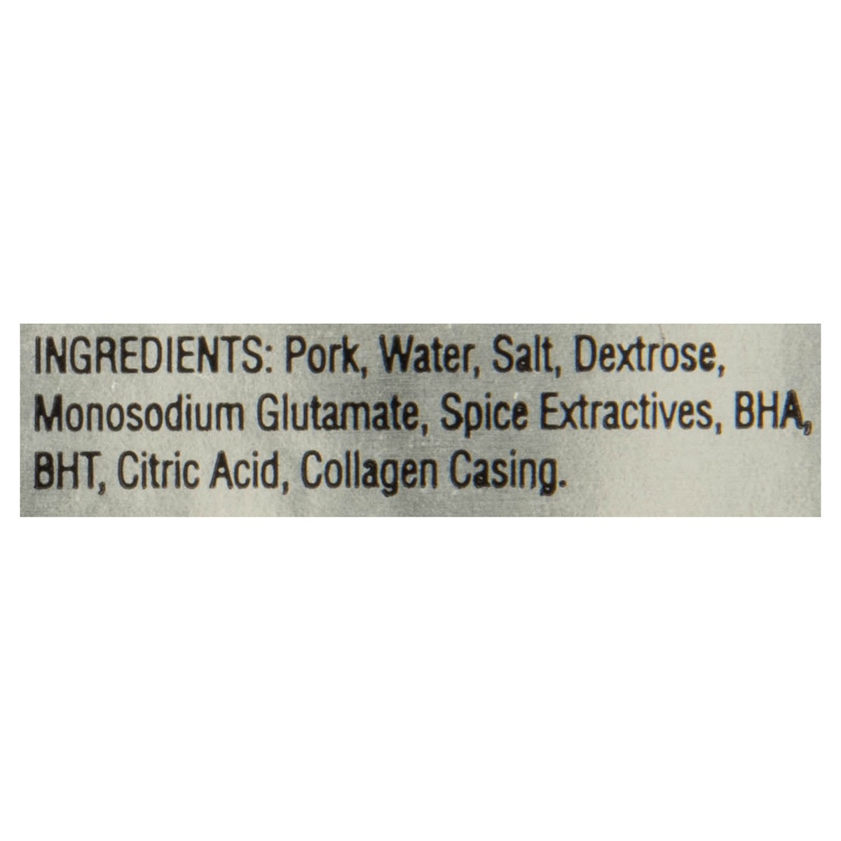 Pork, Water, Salt, Dextrose, Monosodium Glutamate, Spice Extractives, BHA, BHT, Citric Acid, Collagen Casing.