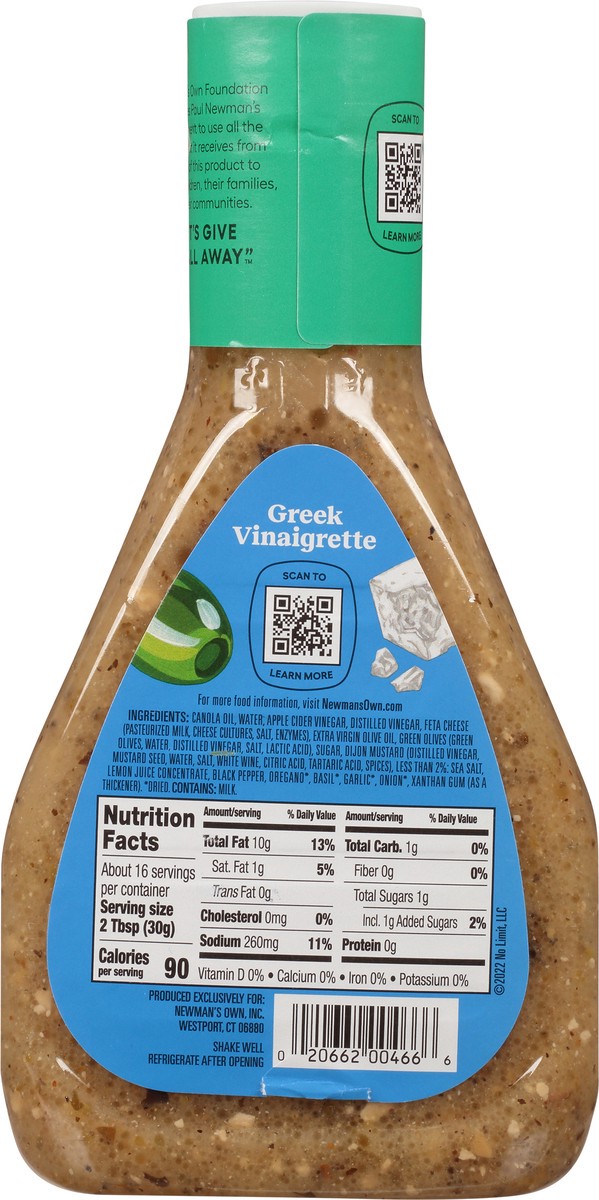 Canola Oil, Water, Apple Cider Vinegar, Distilled Vinegar, Feta Cheese (Pasteurized Milk, Cheese Cultures, Salt, Enzymes), Extra Virgin Olive Oil, Green Olives (Green Olives, Water, Distilled Vinegar,…