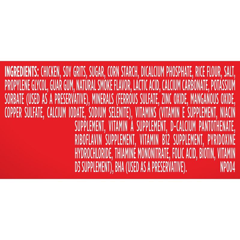 Chicken, Soy Grits, Sugar, Corn Starch, Dicalcium Phosphate, Rice Flour, Salt, Propylene Glycol, Guar Gum, Natural Smoke Flavor, Lactic Acid, Calcium Carbonate, Potassium Sorbate (Used as a Preservati…