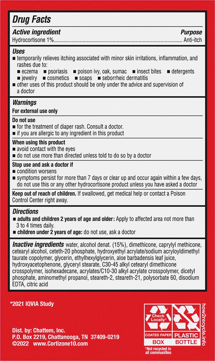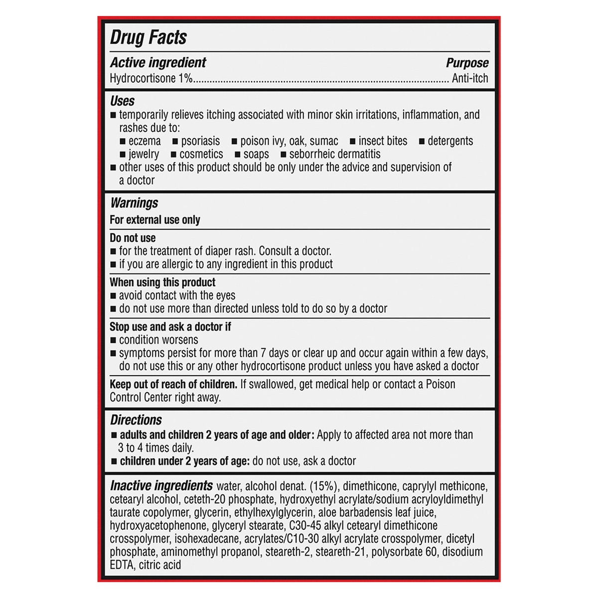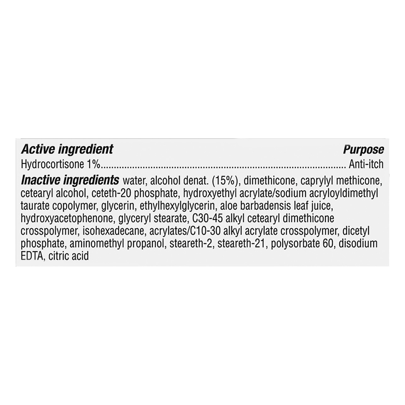 Active Ingredients: Hydrocortisone (1 %), Anti-Itch. Inactive Ingredients: Water, Alcohol Denat. (15%), Dimethicone, Caprylyl Methicone, Cetearyl Alcohol, Ceteth-20 Phosphate, Hydroxyethyl Acrylate/So…
