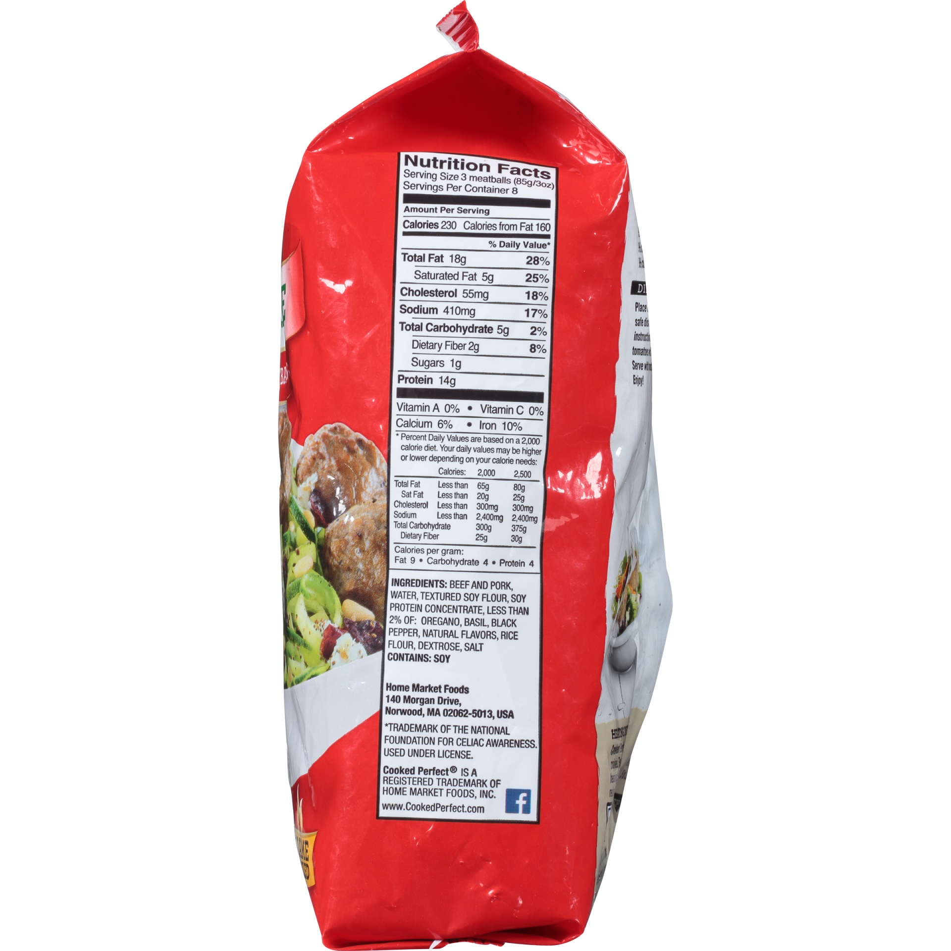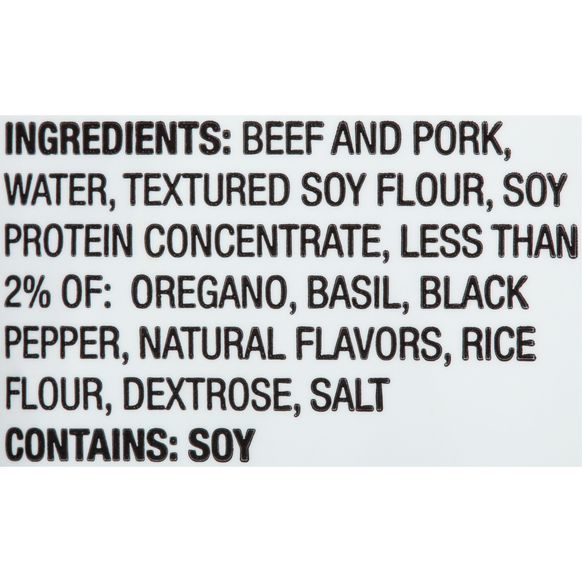 Beef and Pork, Water, Textured Soy Flour, Soy Protein Concentrate, Less than 2% of: Oregano, Basil, Black Pepper, Natural Flavors, Rice Flour, Dextrose, Salt.