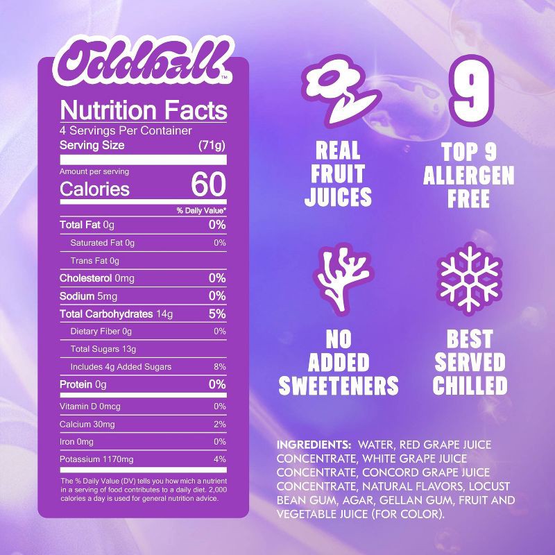 Jiggly fruit snack? We know what that's about. Meet Oddball – a spoonable jelly snack made with real fruit and a signature jiggle. Oddball's Grape Jiggly Fruit Snack is made from real fruit juices, se…