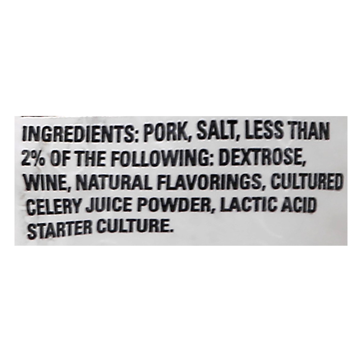 Pork, Salt, Less than 2% of the Following: Dextrose, Wine, Natural Flavorings, Cultured Celery Juice Powder, Lactic Acid Starter Culture.