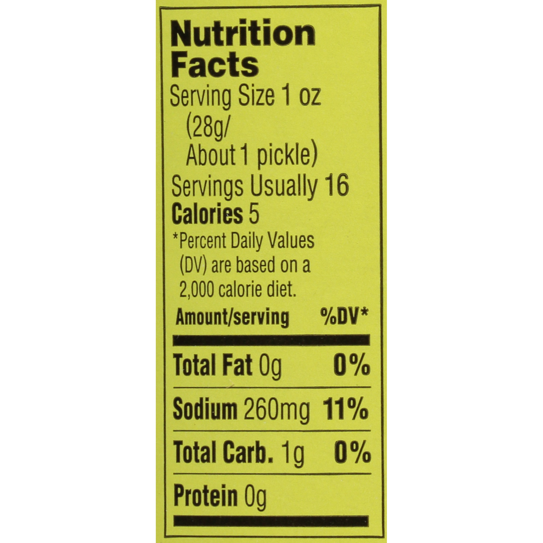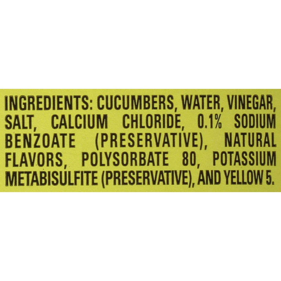 Cucumbers, Water, Vinegar, Salt, Calcium Chloride, (Firming Agent), Sodium Benzoate (Preservative), Natural Flavors, Polysorbate 80, and Yellow 5.