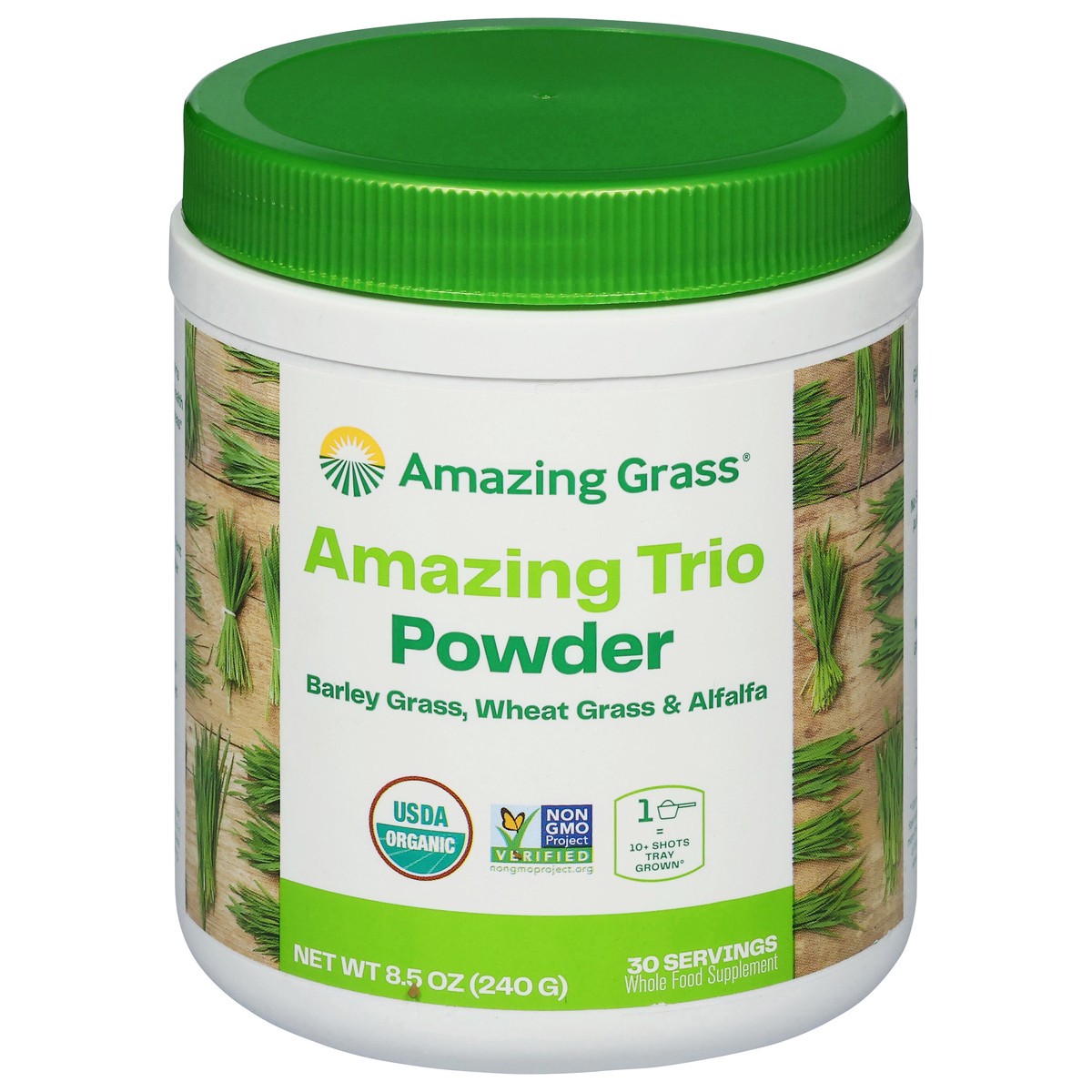 Amazing Grass' amazing trio is organic, farm-grown wheat grass, barley grass and alfalfa, packed with naturally occurring vitamins. They harvest at peak nutrition and cut only the tips of the grass en…