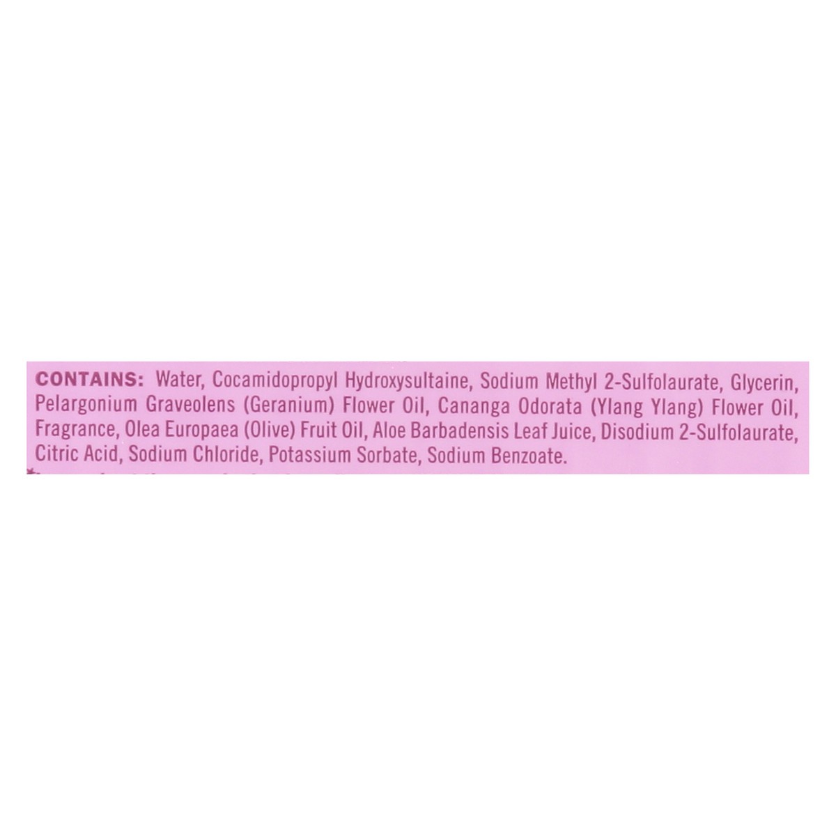 Contains: Water, Cocamidoproply Hydroxysultaine, Sodium Methyl 2-Sulfolaurate, Glycerin, Pelargonium Graveolens (Geranium) Flower Oil, Cananga Odorata (Ylang Ylang) Flower Oil, Fragrance, Olea Europae…