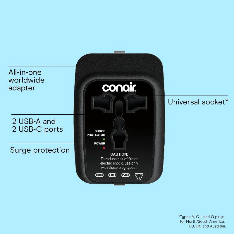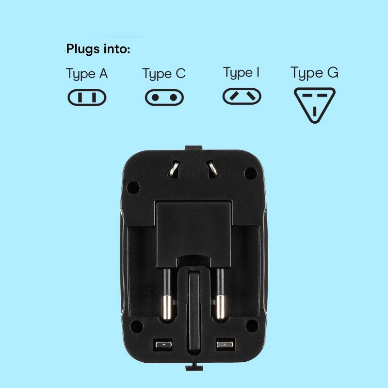 - UNIVERSAL SOCKET: Types A, C, I, and G plugs for North/South America, EU, UK, and Australia.