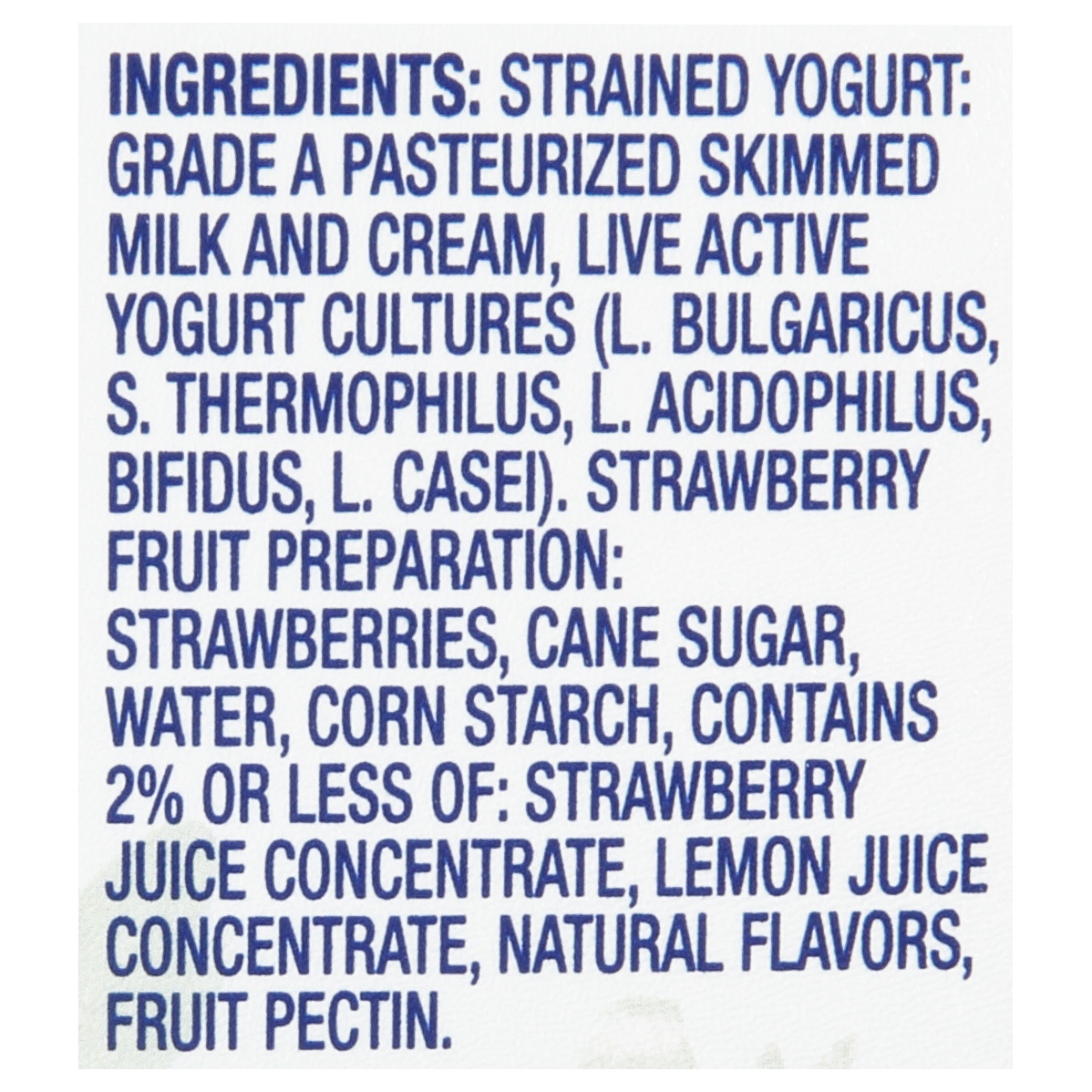 Strained Yogurt: Grade A Pasteurized Skimmed Milk and Cream, Live Active Yogurt Cultures (L. Bulgaricus, S. Thermophilus, L. Acidophilus, Bifidus, L. Casei). Strawberry Fruit Preparation: Strawberries…