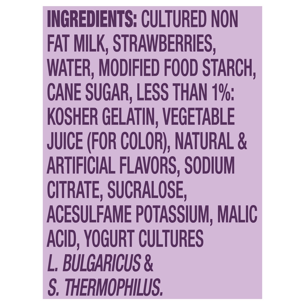 CULTURED NON FAT MILK, STRAWBERRIES, WATER, MODIFIED FOOD STARCH, CANE SUGAR, LESS THAN 1%: KOSHER GELATIN, VEGETABLE JUICE (FOR COLOR), NATURAL & ARTIFICIAL FLAVORS, SODIUM CITRATE, SUCRALOSE, AC…