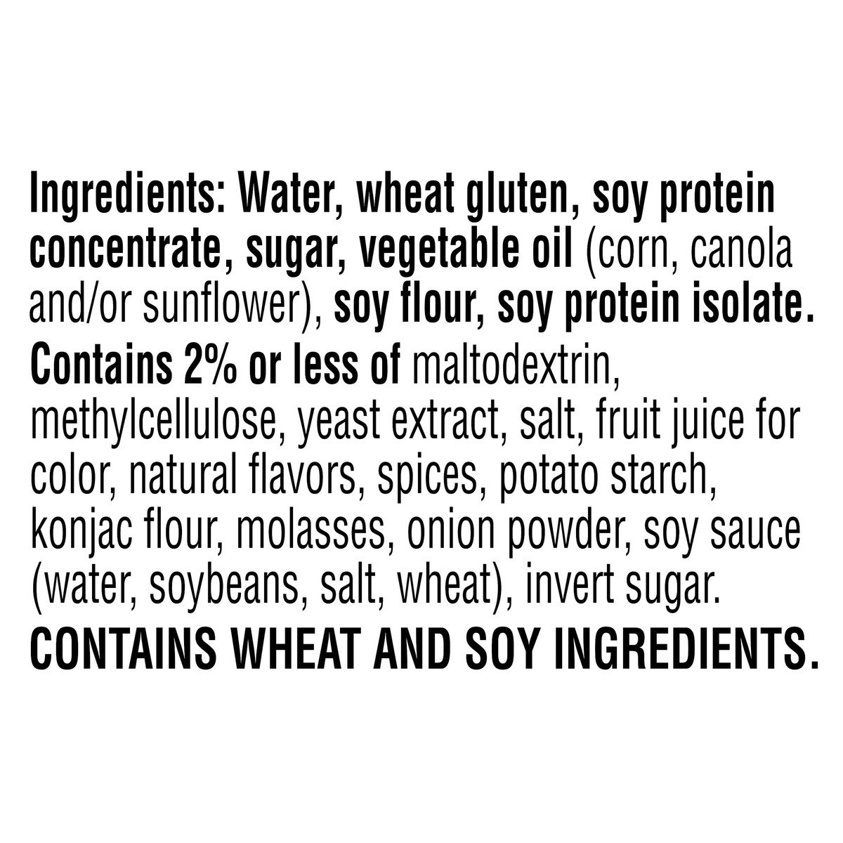 Ingredients: Water, Wheat Gluten, Soy Protein Concentrate, Sugar, Vegetable Oil (Corn, Canola And/Or Sunflower), Soy Flour, Soy Protein Isolate. Contains 2% Or Less Of Maltodextrin, Methylcellulose, Y…