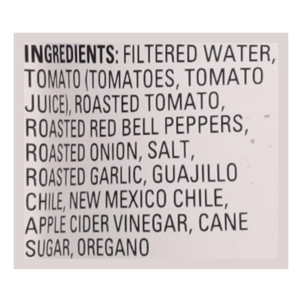 Filtered Water, Tomato (Tomatoes, Tomato Juice), Roasted Tomato, Roasted Red Bell Peppers, Roasted Onion, Salt, Roasted Garlic, Guajillo Chile, New Mexico Chile, Apple Cider Vinegar, Cane Sugar, Orega…