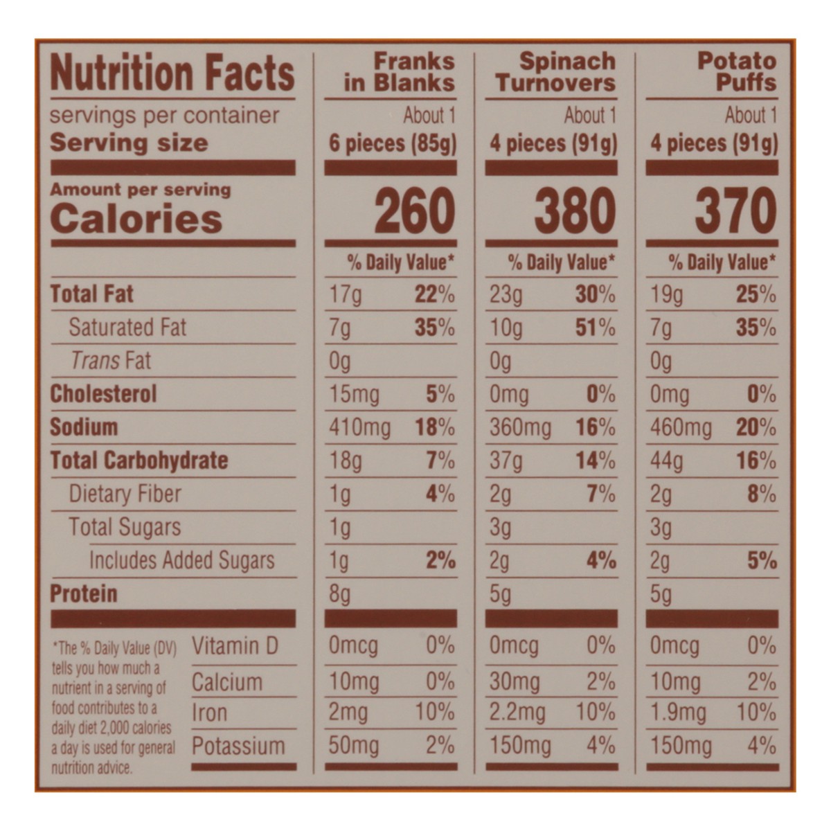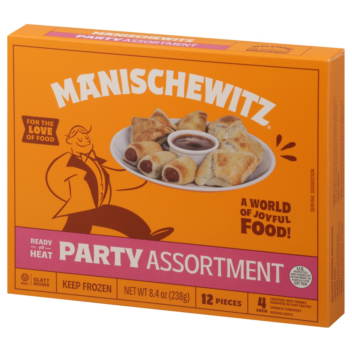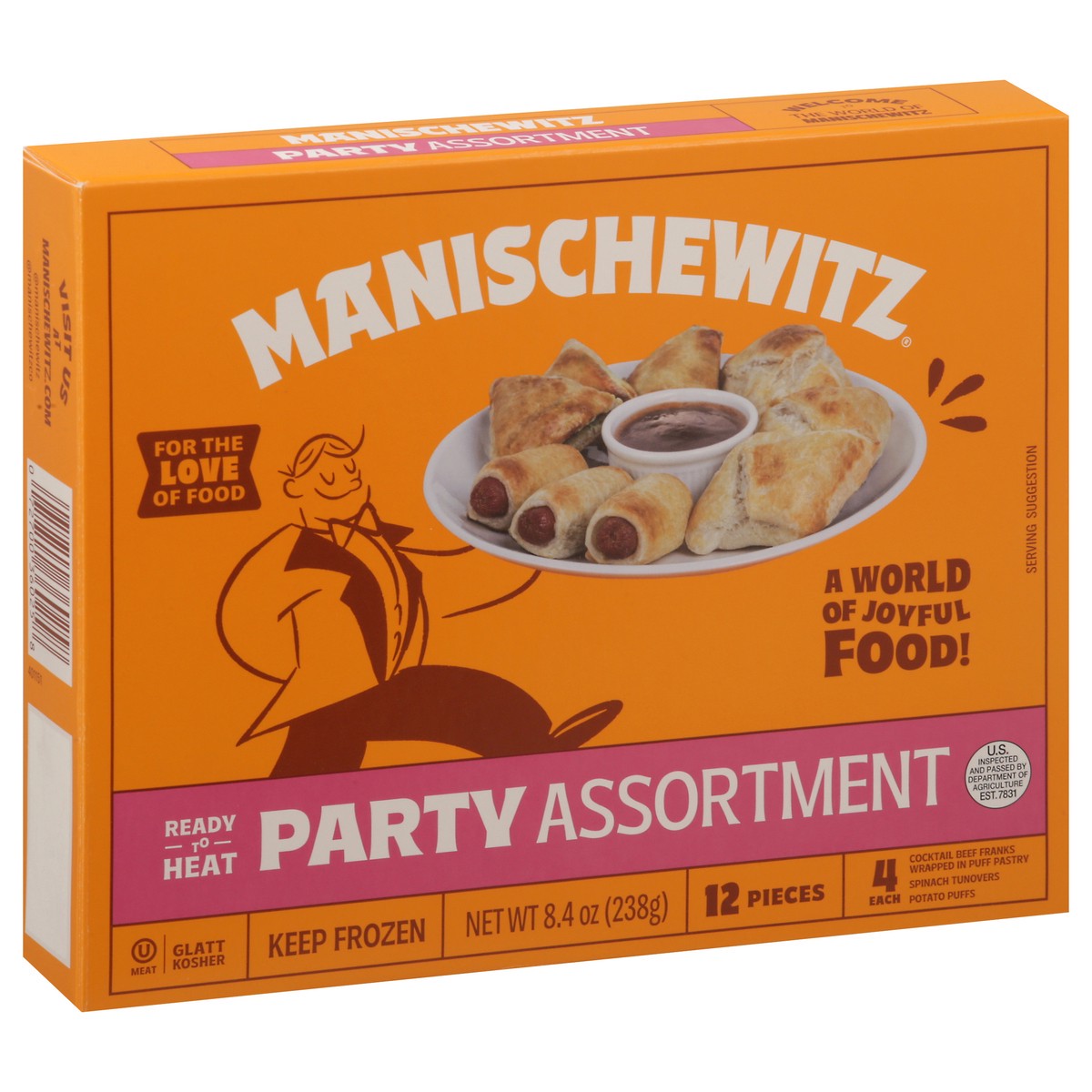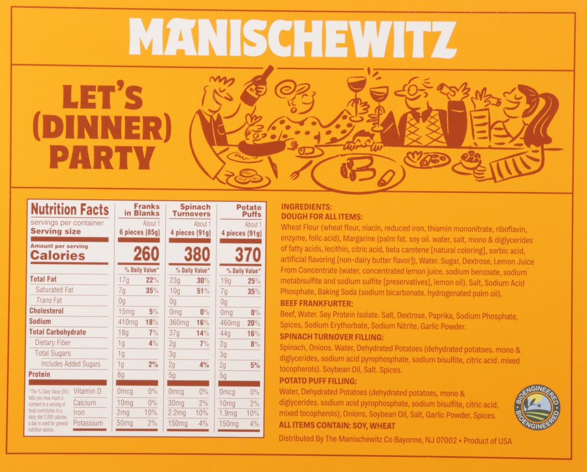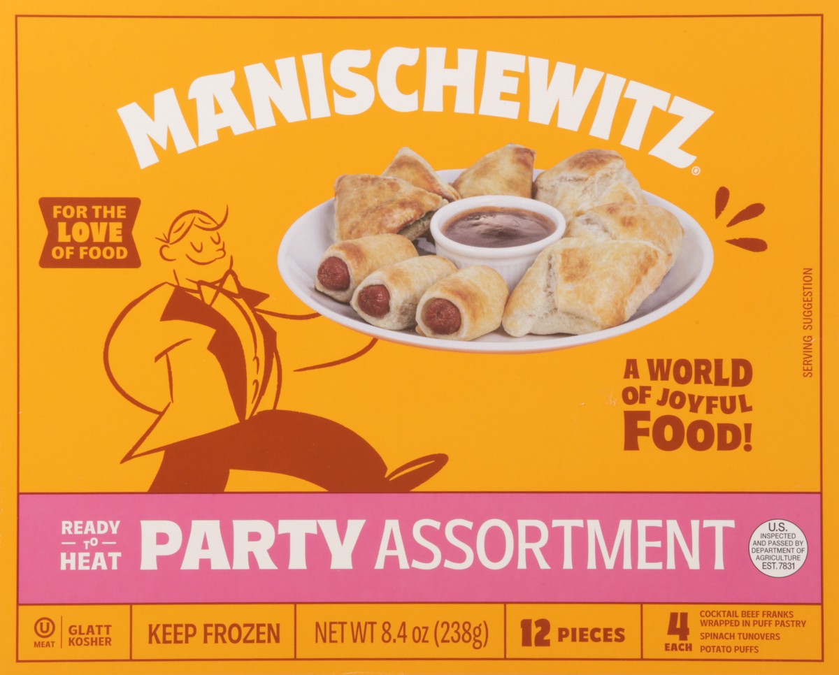 Ready to heat and serve, this Manischewitz party assortment of tasty appetizers includes:• 4 puff pastry wrapped cocktail beef franks• 4 spinach turnovers• 4 potato puffs
