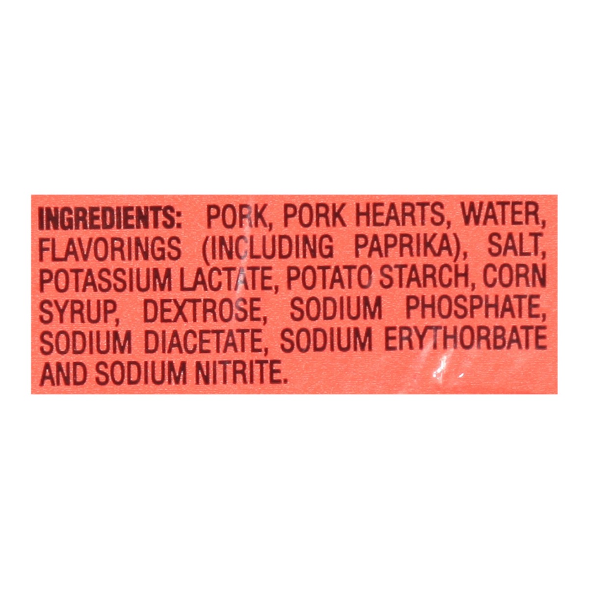Pork, Pork Hearts, Water, Flavorings (Including Paprika), Salt, Potassium Lactate, Potato Starch, Corn Syrup, Dextrose, Sodium Phosphate, Sodium Diacetate, Sodium Erythorbate and Sodium Nitrite.