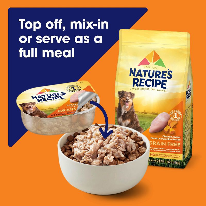 - Contains one (1) 2.75-ounce cup of Nature's Recipe grain free dog food