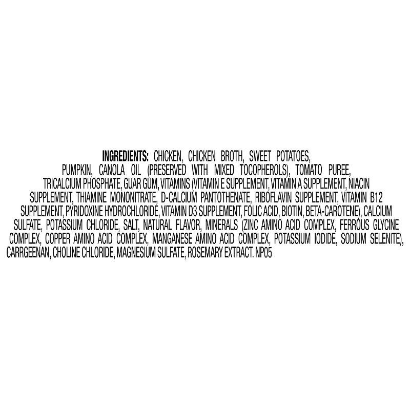 Chicken, Chicken Broth, Sweet Potatoes, Pumpkin, Canola Oil (Preserved with Mixed Tocopherols), Tomato Puree, Tricalcium Phosphate, Guar Gum, Vitamins (Vitamin E Supplement, Vitamin A Supplement, Niac…