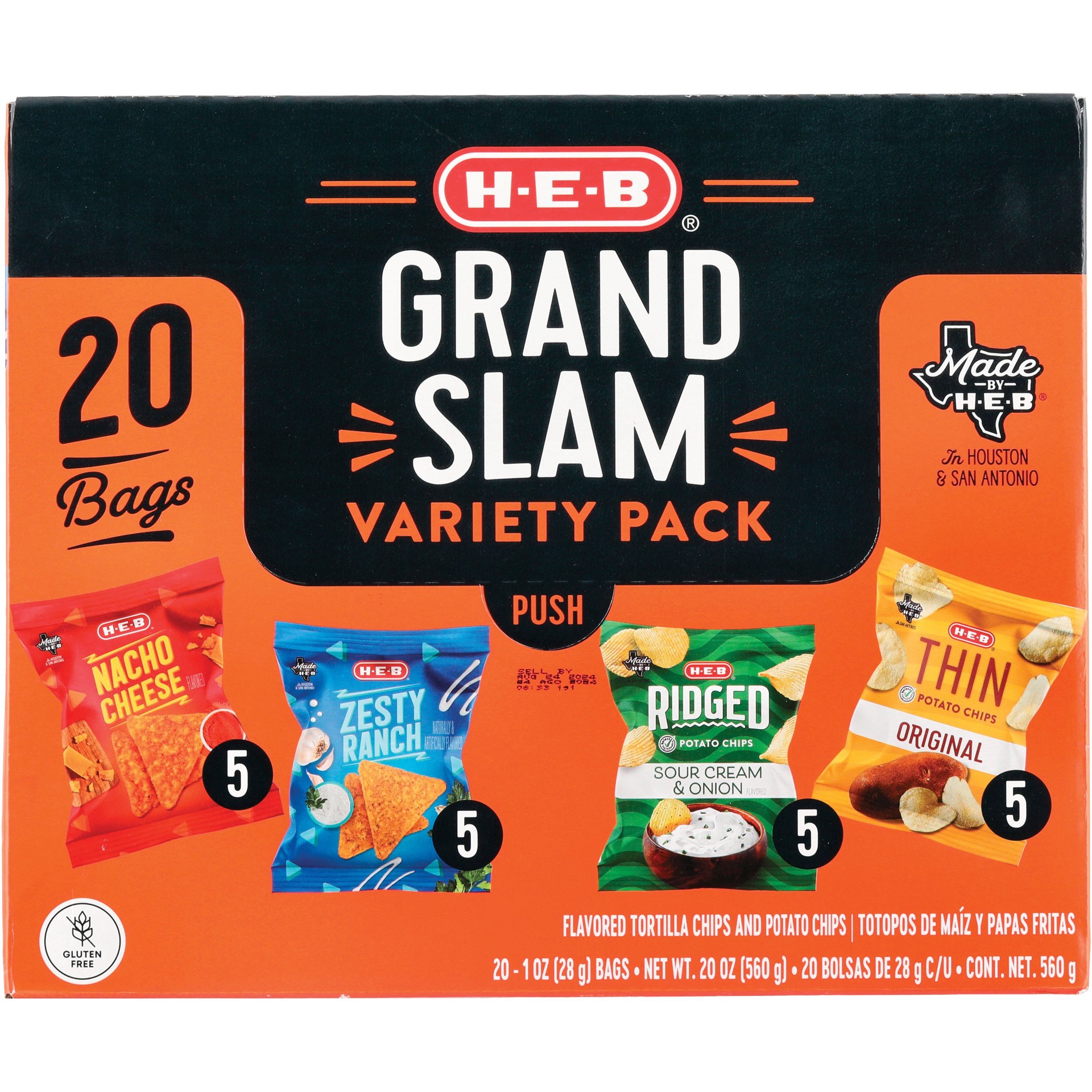 When it's time to stock up on salty snacks, reach for the H-E-B Grand Slam variety pack of popular chips. It's a total of 20 individual bags, all 1-oz each. You get 5 bags of each of the following fla…
