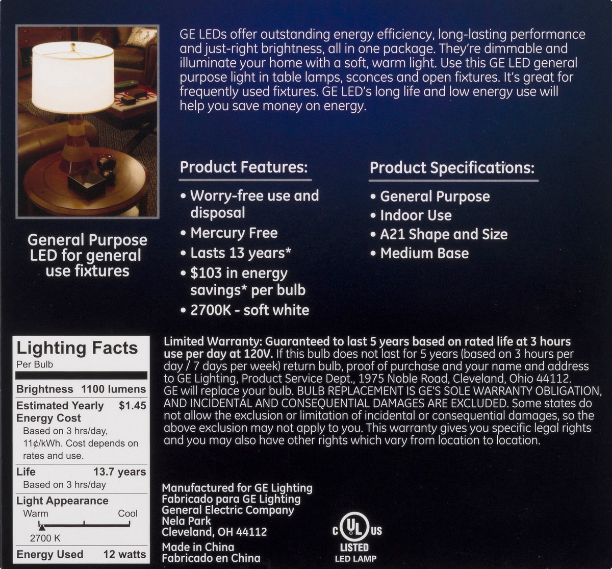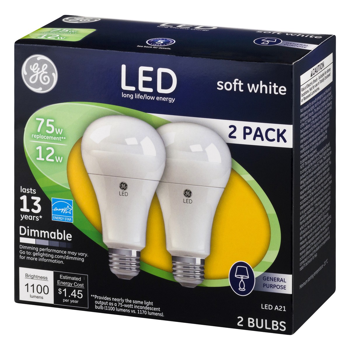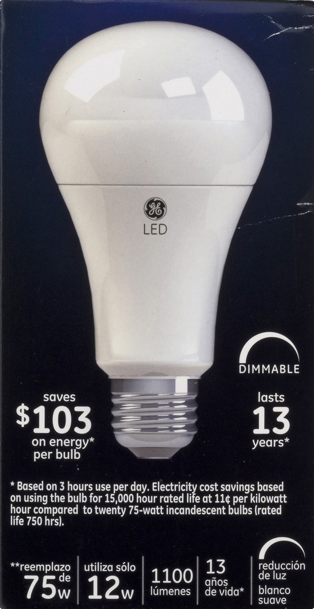 Long life/low energy. 75 watts replacement (Provides nearly the same light output as a 75-watt incandescent bulb (1100 lumens vs 1170 lumens)). Brightness: 1100 lumens. Estimated Energy Cost: $1.45 pe…