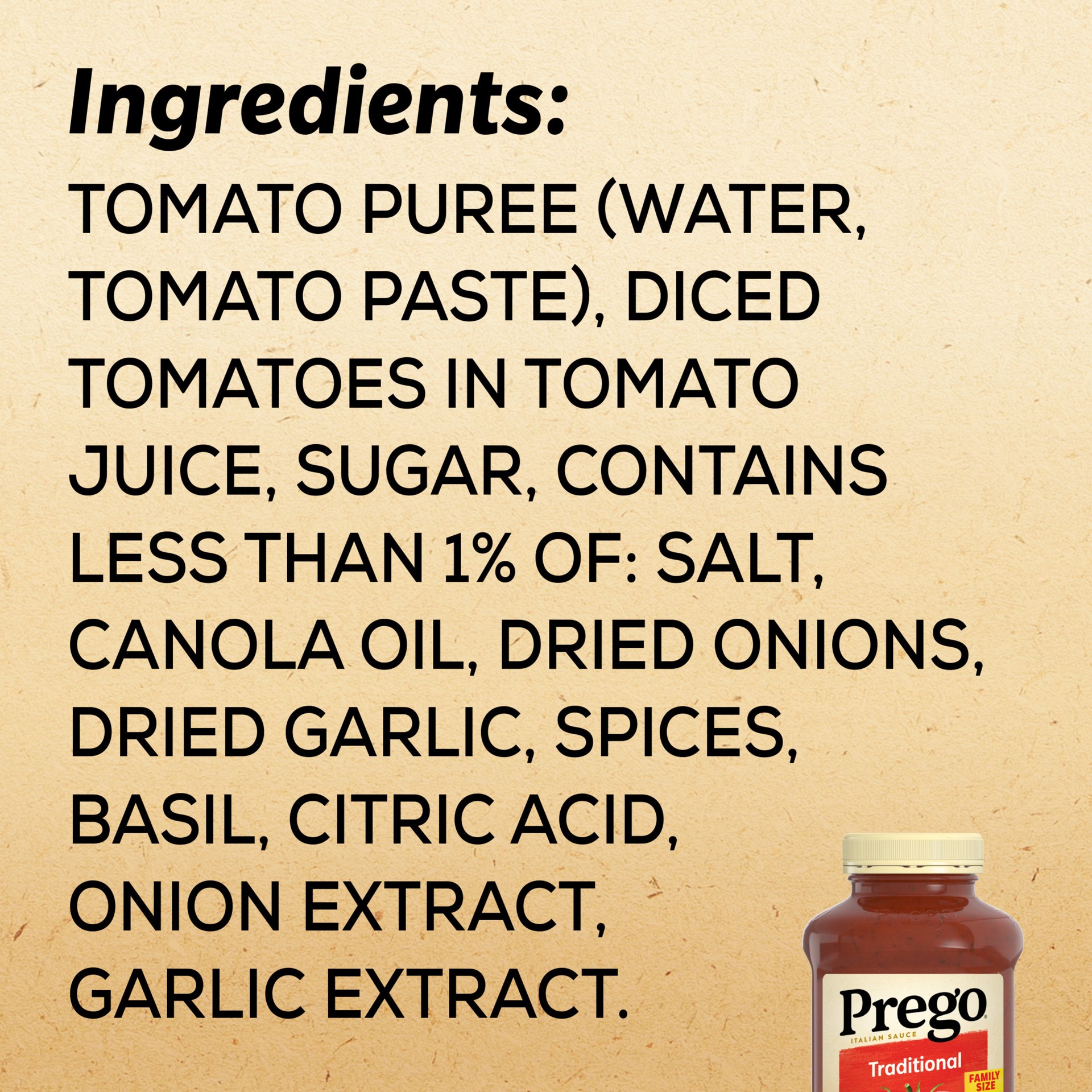 INGREDIENTS: TOMATO PUREE (WATER, TOMATO PASTE), DICED TOMATOES IN TOMATO JUICE, SUGAR, CONTAINS LESS THAN 1% OF: SALT, CANOLA OIL, DRIED ONIONS, DRIED GARLIC, SPICES, BASIL, CITRIC ACID, ONION EXTRAC…