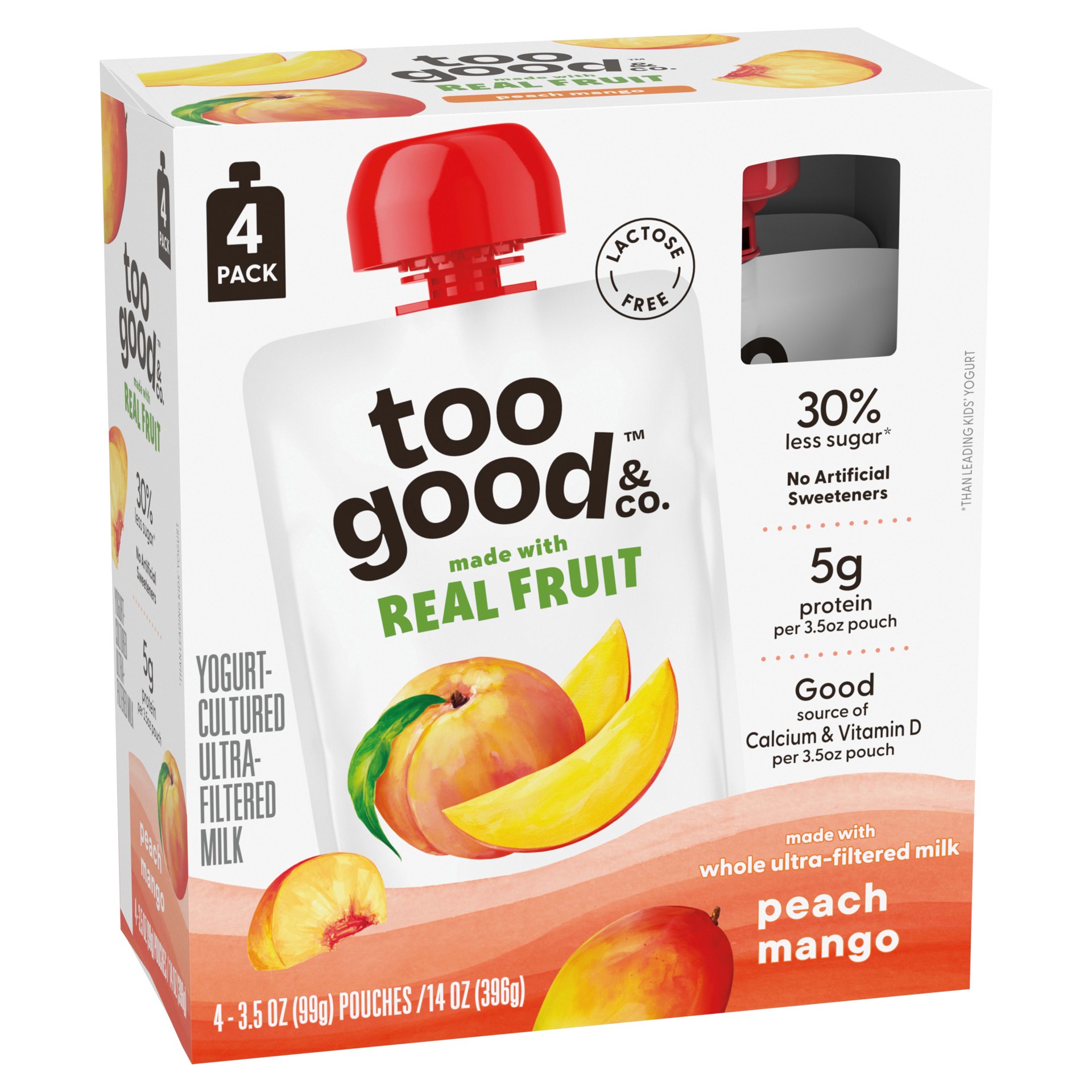 Give your kids good that tastes great with Too Good & Co. Peach Mango Yogurt-Cultured Ultra-Filtered Milk Pouches. Too Good kids pouches are made with real fruit, 30% less sugar* and 5g protein. These…