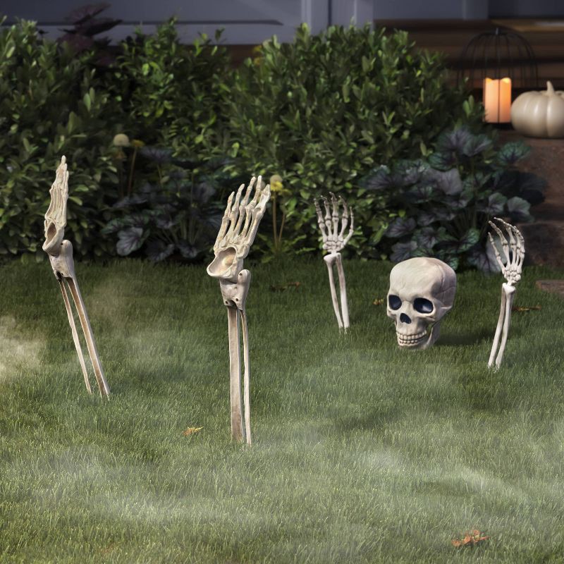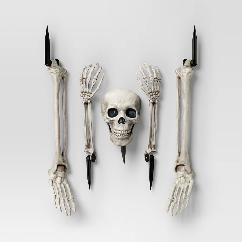 - 5pc decorative prop includes a skull, hands and legs for scary appeal