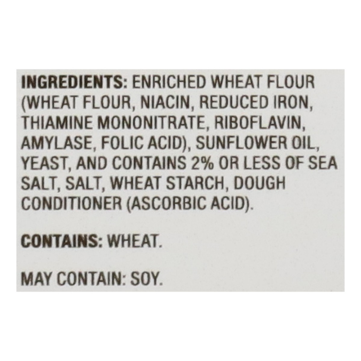 Enriched Wheat Flour (Wheat Flour, Niacin, Reduced Iron, Thiamine Mononitrate, Ribolfavin, Amylase, Folic Acid), Sunflower Oil, Yeast and Contains 2% or Less of Sea Salt, Salt, Wheat Starch, Dough Con…